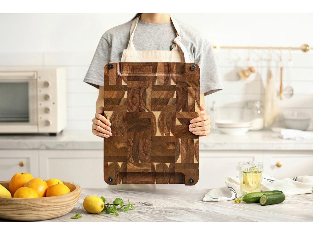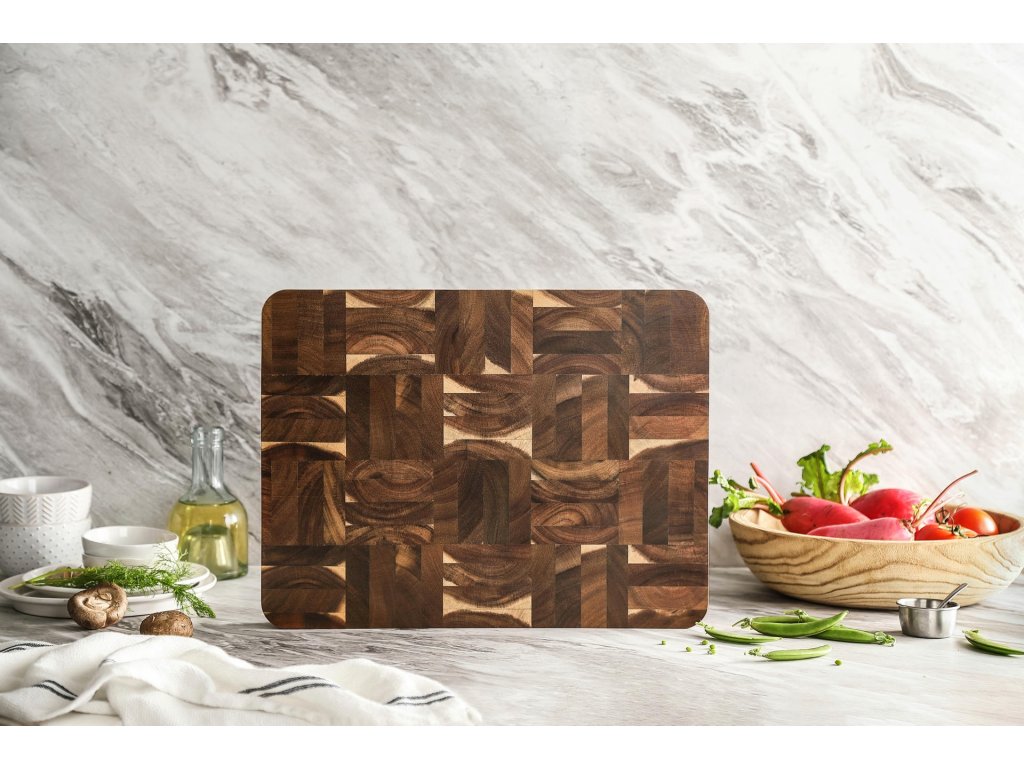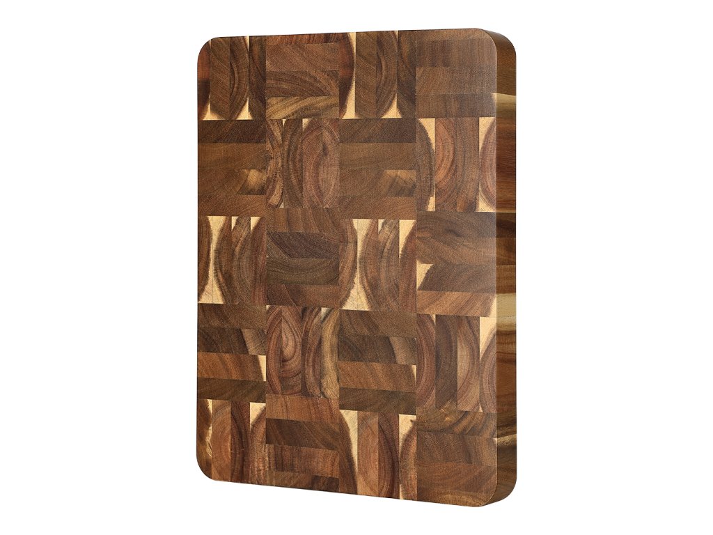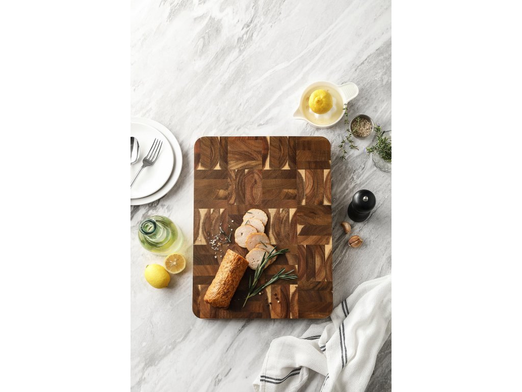 Każda deska przechodzi unikalny, wieloetapowy proces szlifowania, po którym jej powierzchnia, w tym krawędzie, jest bardzo gładka. Naturalny materiał umożliwia łatwe czyszczenie. Deska do krojenia ma grubość 4,2 cm i wykonano ją z materiału najwyższej jakości, w związku z czym niełatwo ją uszkodzić. Technika łączenia poszczególnych kawałków drewna akacjowego pozwala na stworzenie wyjątkowej faktury deski.