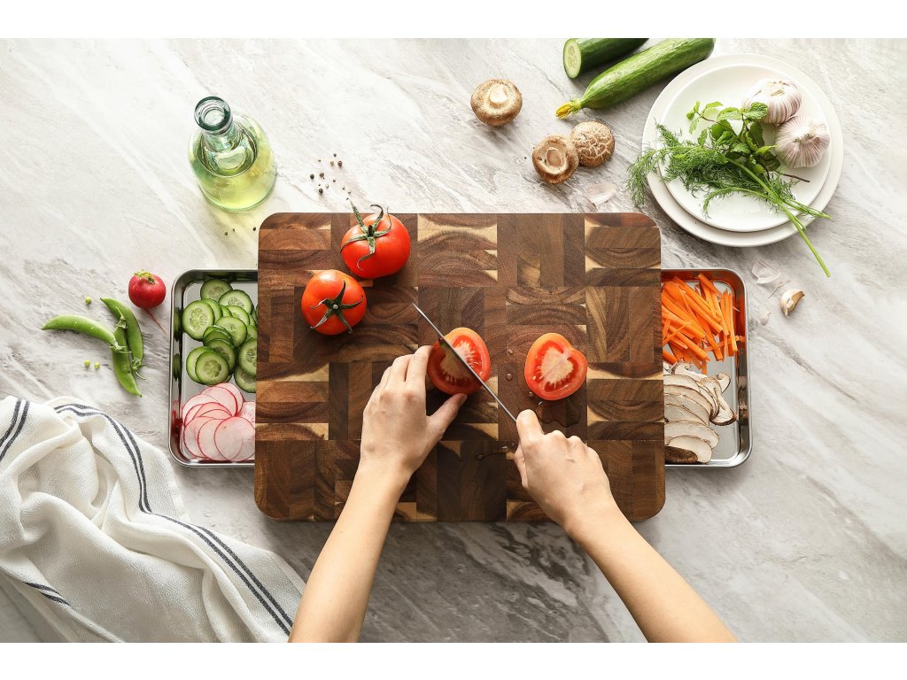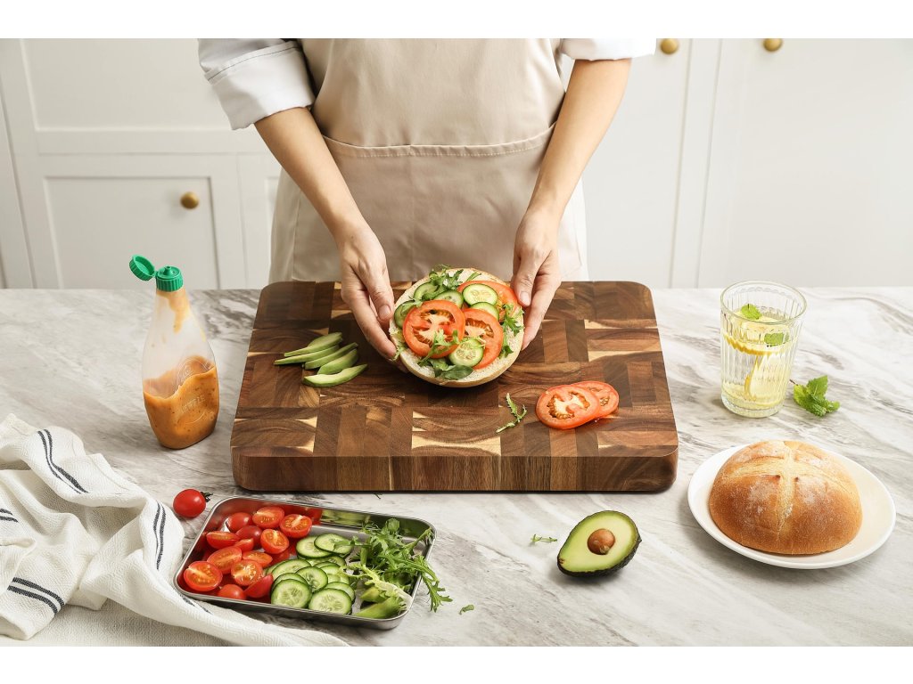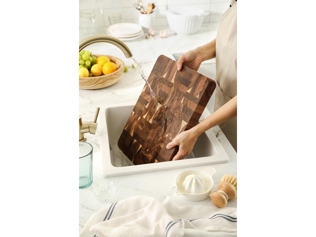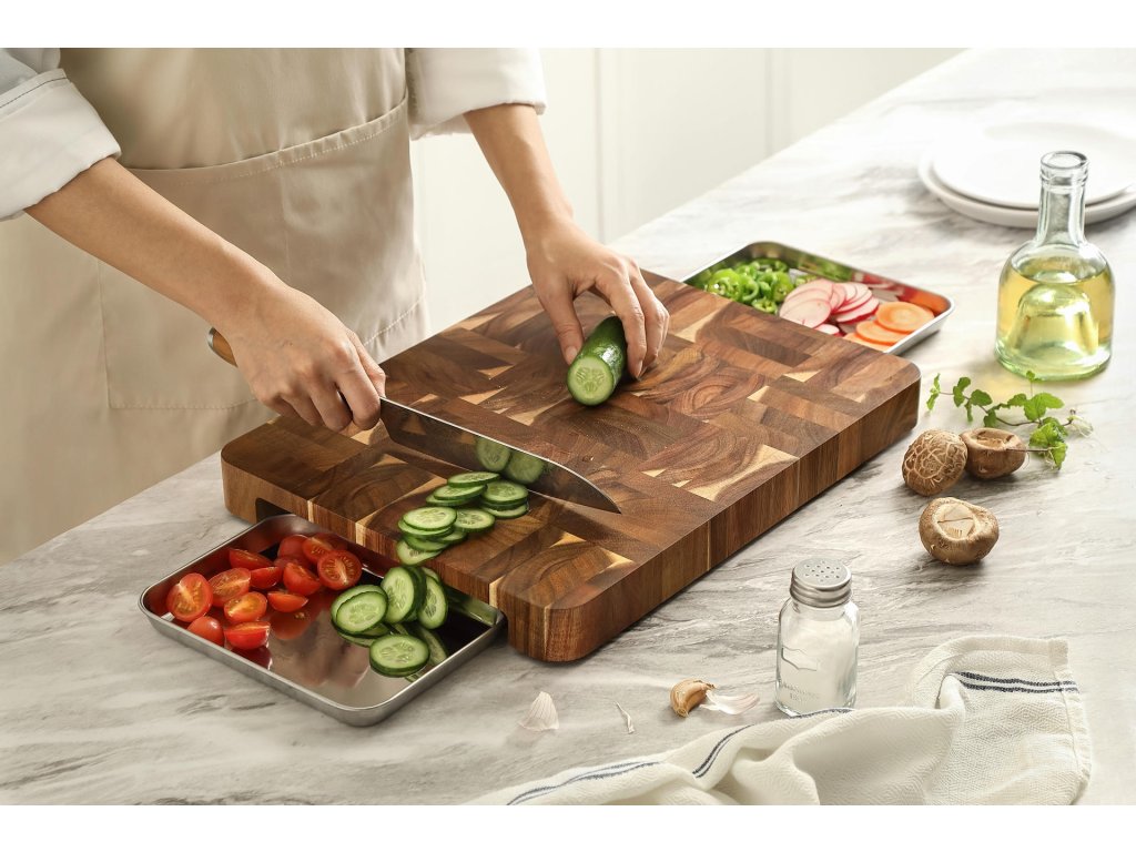 Każda deska przechodzi unikalny, wieloetapowy proces szlifowania, po którym jej powierzchnia, w tym krawędzie, jest bardzo gładka. Naturalny materiał umożliwia łatwe czyszczenie. Deska do krojenia ma grubość 4,2 cm i wykonano ją z materiału najwyższej jakości, w związku z czym niełatwo ją uszkodzić. Technika łączenia poszczególnych kawałków drewna akacjowego pozwala na stworzenie wyjątkowej faktury deski.