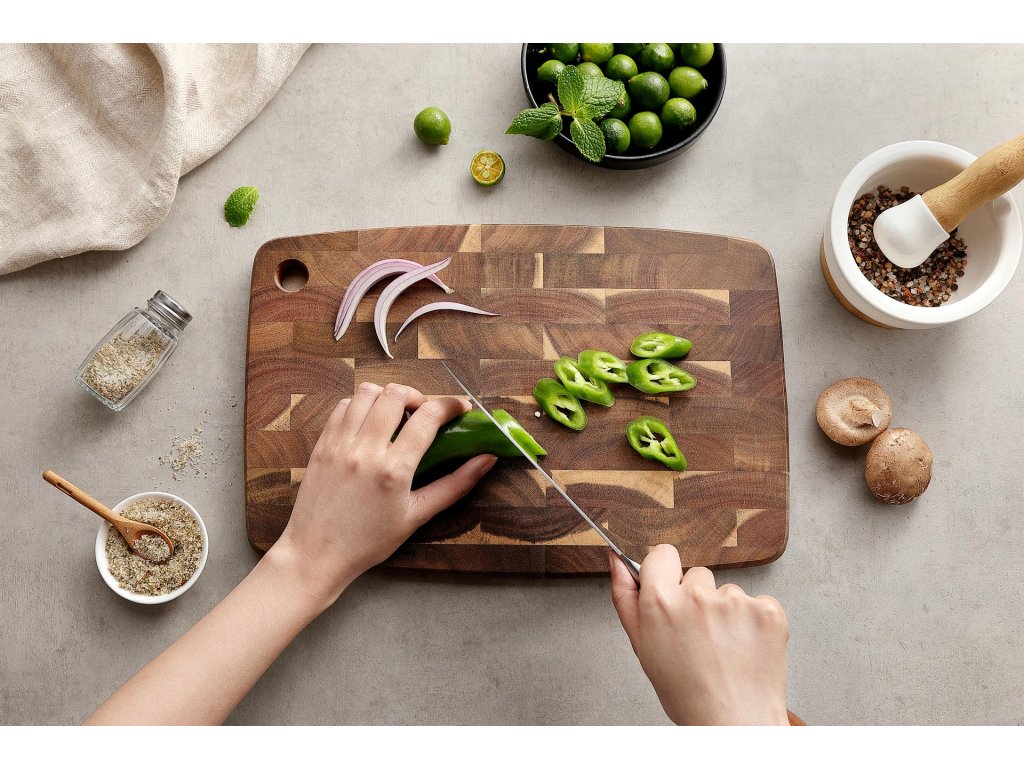 Struktura end-grain podkreśla naturalne usłojenie drewna, a jednocześnie zapewnia długą żywotność i odporność podczas krojenia.