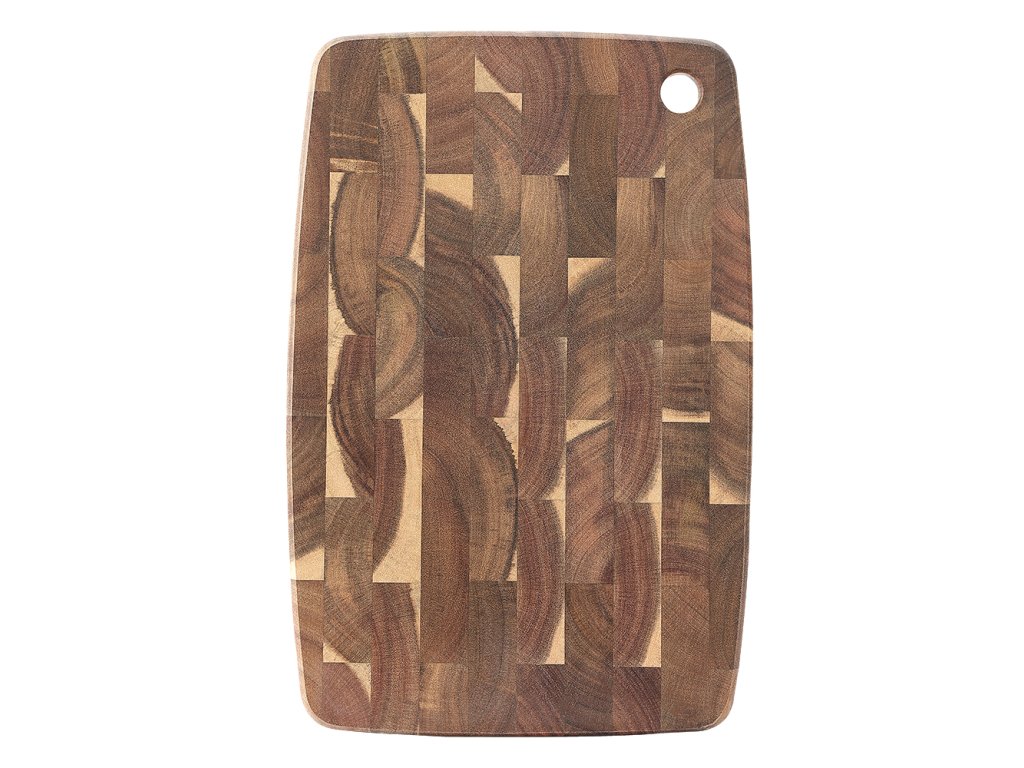 Deska do krojenia z drewna akacjowego o eleganckiej fakturze End-grain, dopracowana w najdrobniejszych szczegółach. Bez gumowych nóżek.