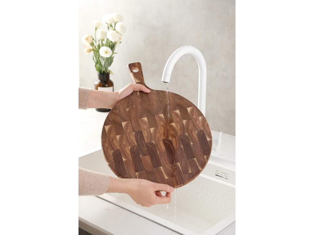 Wysokiej jakości okrągła deska do krojenia XinZuo z drewna akacjowego, wyposażona w praktyczny uchwyt. Powierzchnia deski jest bardzo gładka, a tym samym delikatna dla ostrzy noży kuchennych. Od razu zaintryguje cię swą piękną fakturą. Solidna konstrukcja deski z tradycyjną, płaską powierzchnią bez żadnych żłobień. Deska będzie idealna dla miłośników prostego, naturalnego designu - bez gumowych czy plastikowych nóżek.