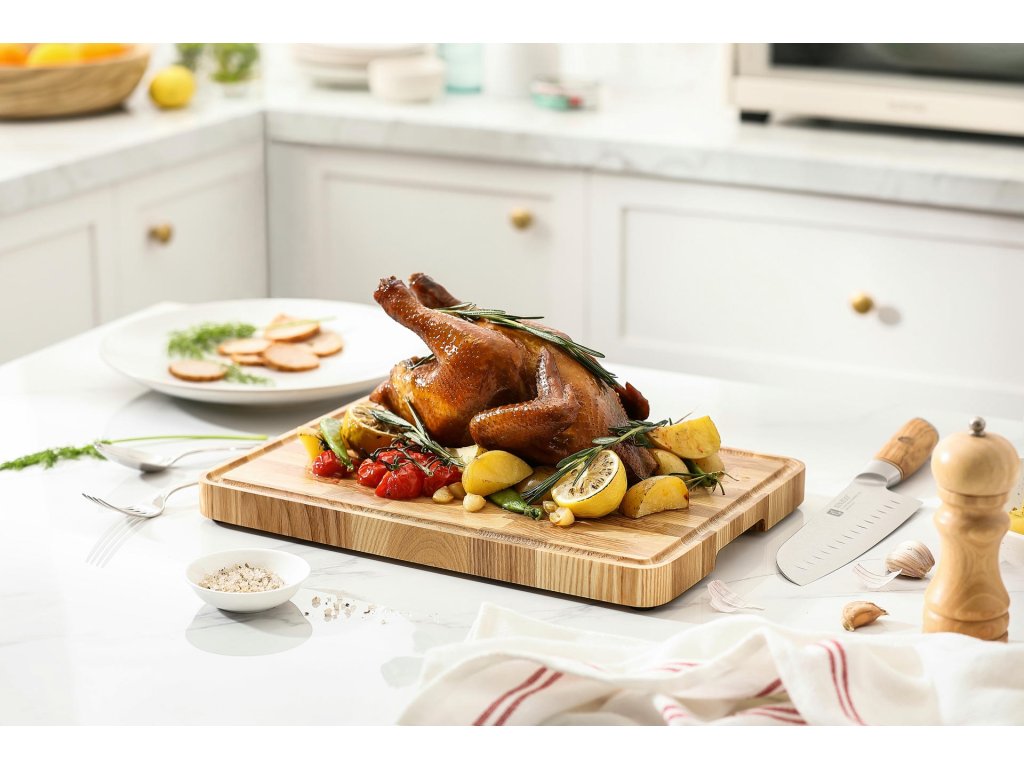 Wysokiej jakości deska do krojenia XinZuo z drewna jesionu. Powierzchnia deski jest bardzo delikatna, a tym samym przyjazna dla ostrzy noży kuchennych. Od razu zaintryguje cię swą piękną, jasną fakturą. Solidna konstrukcja deski z pojedynczych kawałków drewna zapewnia jej stabilność oraz odporność na zużycie.