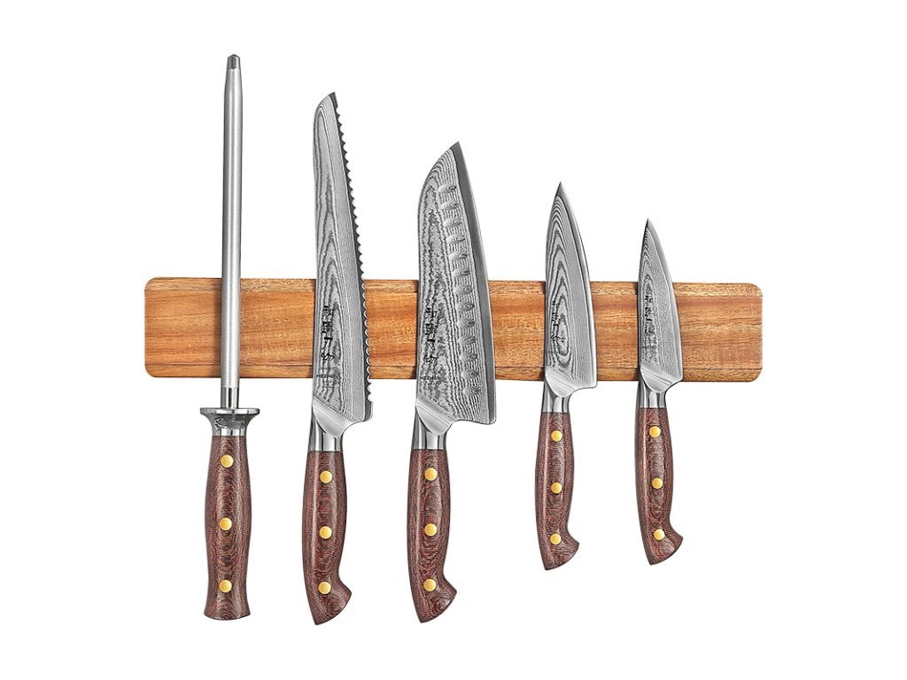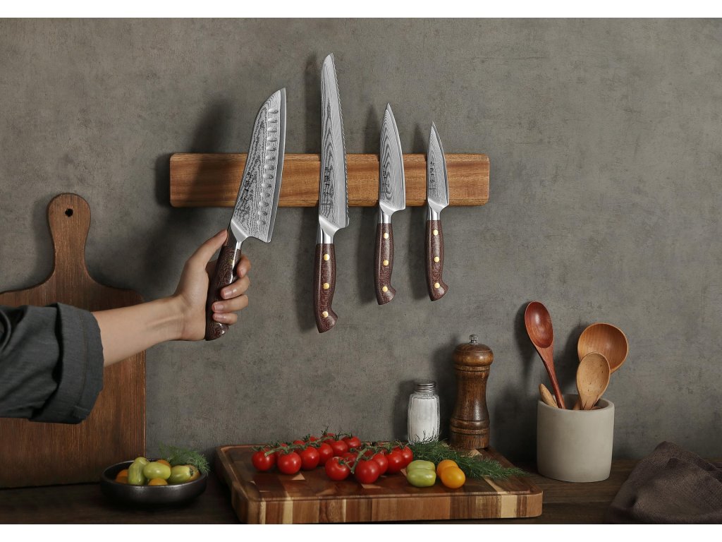 Stylowa listwa magnetyczna na noże z jasnego, akacjowego drewna. Stanowi nowoczesny sposób przechowywania noży kuchennych XinZuo i HEZHEN, uwydatniający ich piękno i luksusowe wykończenie.