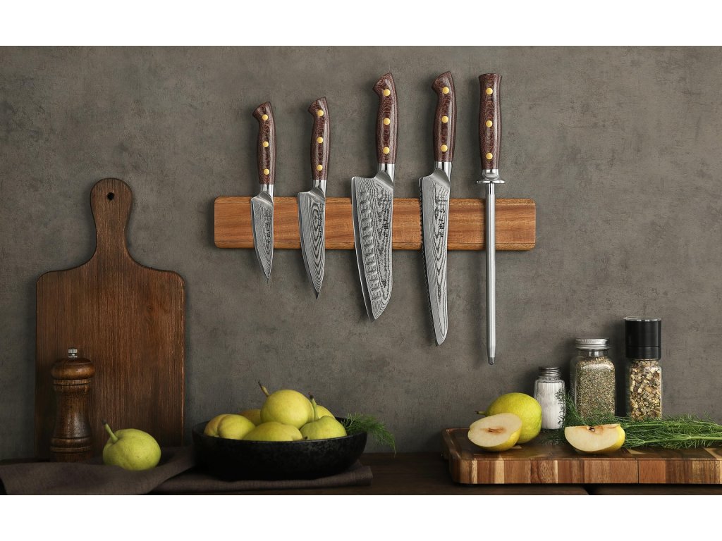 Noże przymocowane do drewnianej listwy magnetycznej prezentują piękno swych ostrzy w pełnej krasie. Idealna na noże kuchenne z grawerunkiem - dzięki niej będzie stale w zasięgu wzroku.