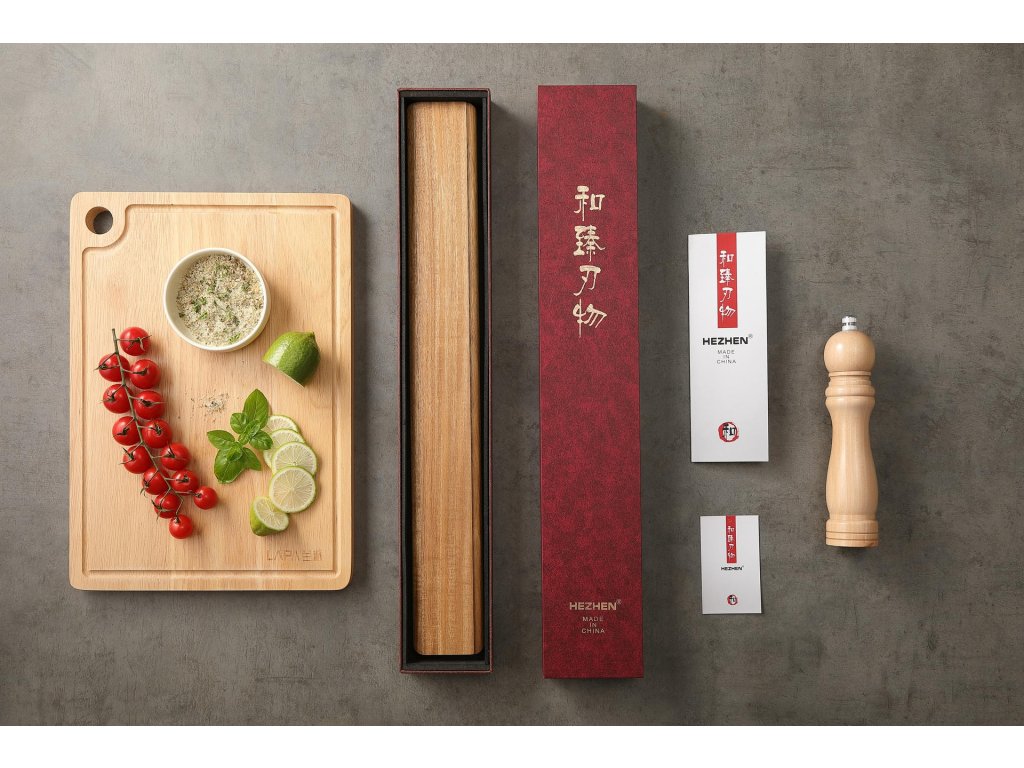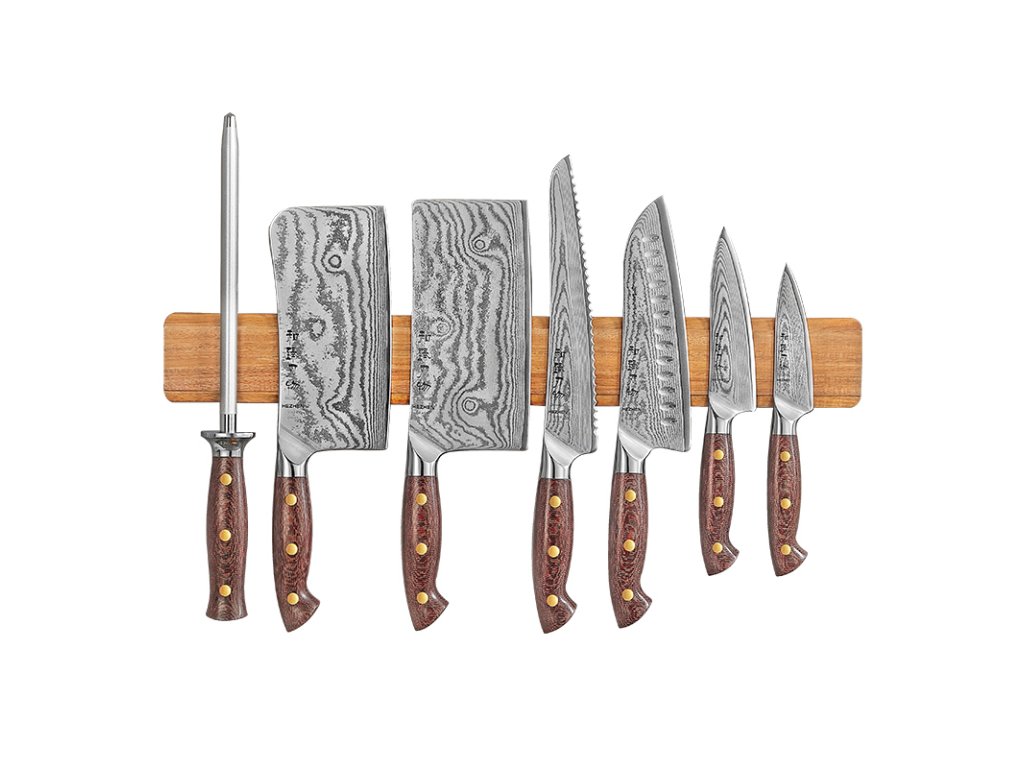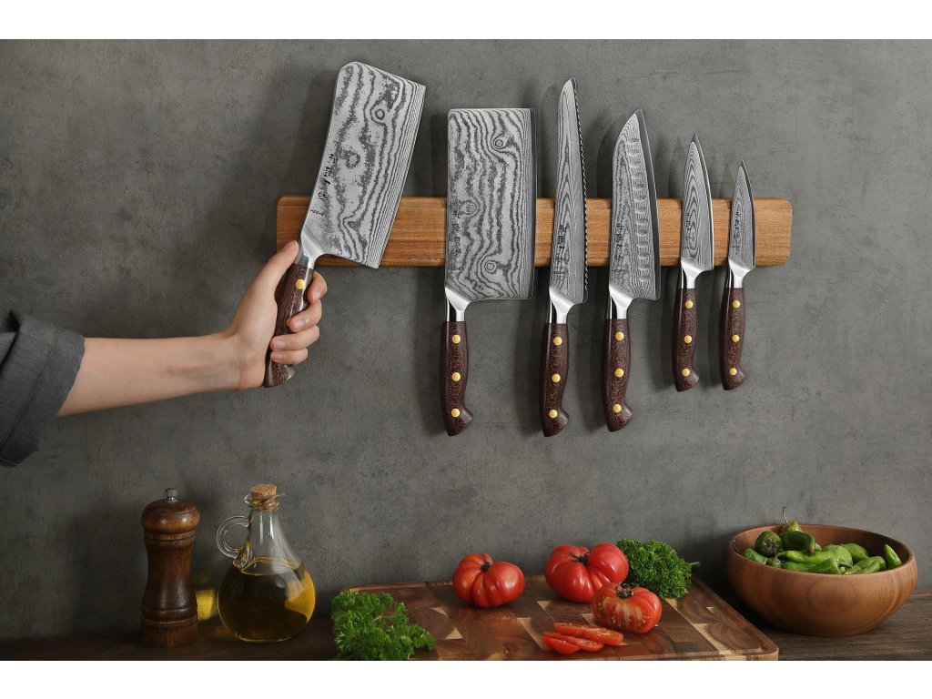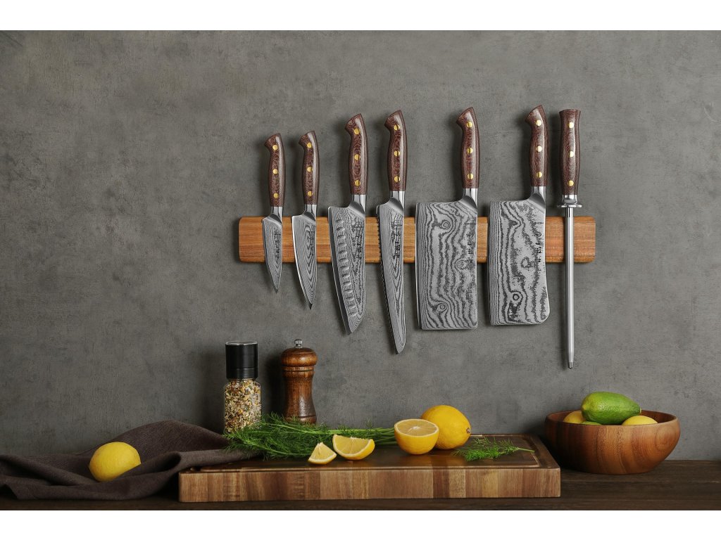 Stylowa listwa magnetyczna na noże z jasnego, akacjowego drewna. Stanowi nowoczesny sposób przechowywania noży kuchennych XinZuo i HEZHEN, uwydatniający ich piękno i luksusowe wykończenie.