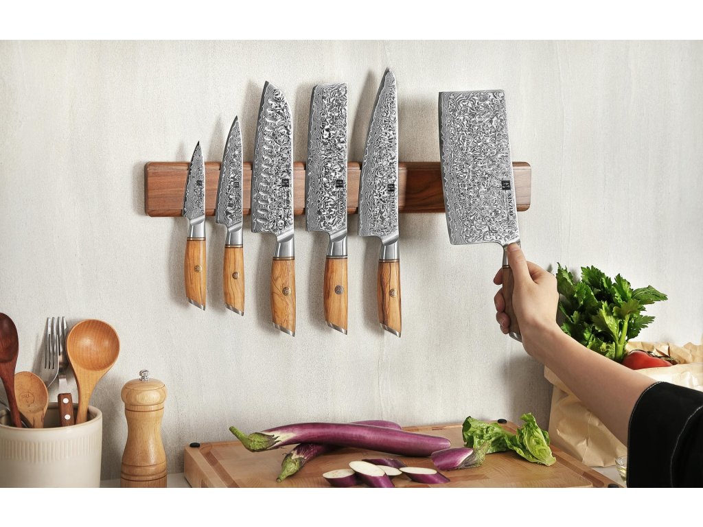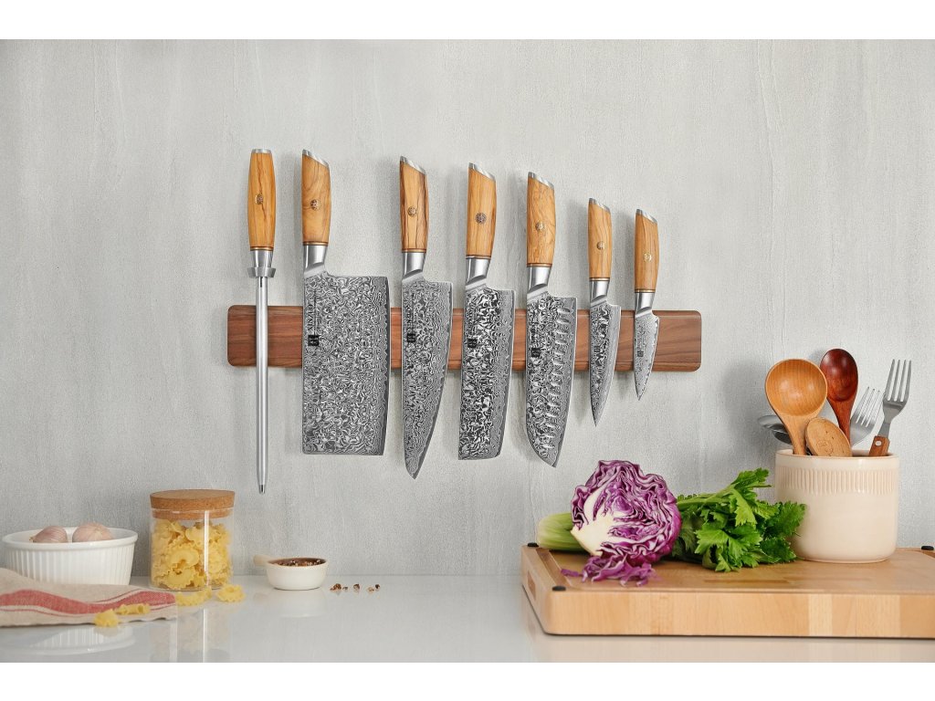 Noże przymocowane do drewnianej listwy magnetycznej prezentują piękno swych ostrzy w pełnej krasie. Idealna na noże kuchenne z grawerunkiem - dzięki niej będzie stale w zasięgu wzroku.