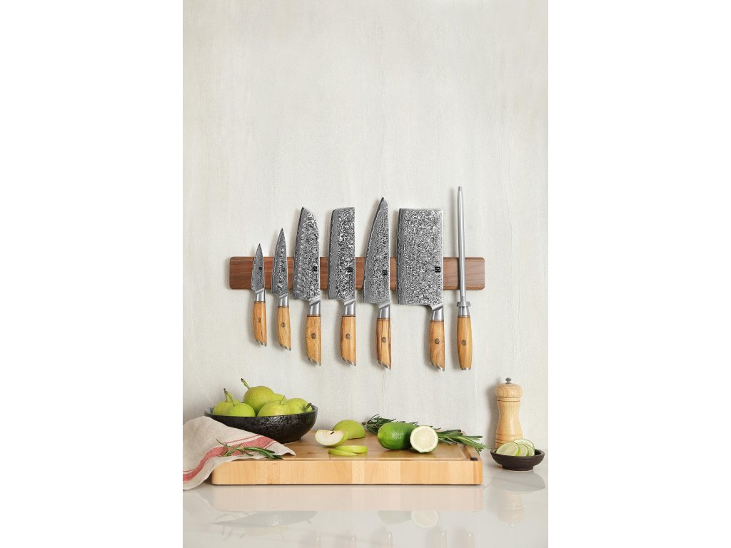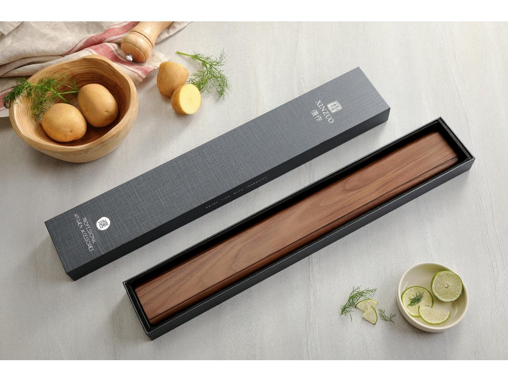Elegancka listwa magnetyczna na noże z drewna orzecha. Stanowi nowoczesny sposób przechowywania noży kuchennych XinZuo i HEZHEN, uwydatniający ich piękno i luksusowe wykończenie.