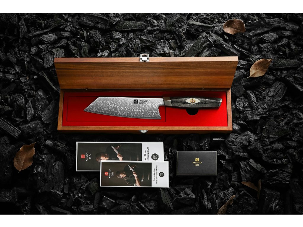 Nóż Bunka klasy premium XinZuo Li X04 7" z ostrzem wykonanym z misternie skuwanych 145 warstw stali, tworzących unikalny wzór damasceński. Nowoczesna rękojeść z włókna węglowego w eleganckim drewnianym pudełku.