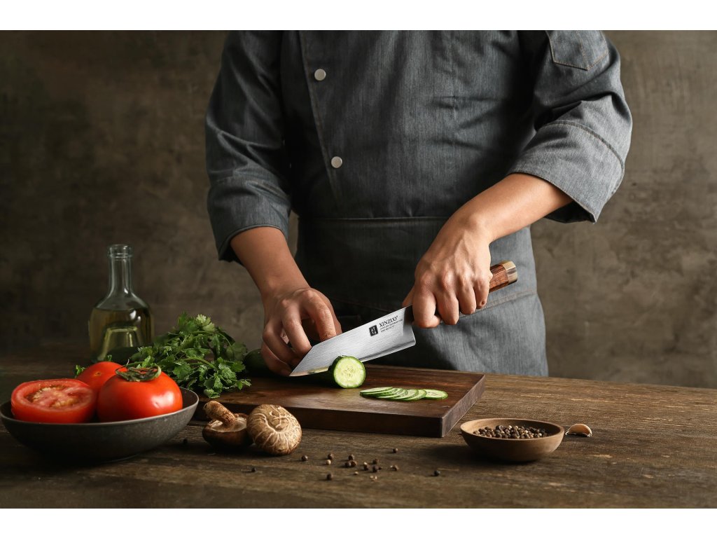 Ciekawostka: jako wiodący innowator w dziedzinie produkcji noży kuchennych XinZuo łączy ze sobą tradycyjne i najnowocześniejsze technologie. Dzięki zastosowanej nowatorskiej metodzie próżniowej obróbki cieplnej noże kuchenne XinZuo charakteryzują się - w porównaniu z nożami powstałymi przy wykorzystaniu standardowej obróbki cieplnej - większą twardością i ostrością, a ponadto dłuższą żywotnością. W połączeniu z tradycyjnym, wieńczącym proces produkcji ręcznym ostrzeniem noży przez mistrzów tego rzemiosła, których przekazywanemu z pokolenia na pokolenie kunsztowi nie może się równać żadna maszyna, skutkuje to tym, że noże kuchenne XinZuo są także wyjątkowo ostre. Noże ostrzone maszynowo nie mają szans na osiągnięcie tego poziomu ostrości.