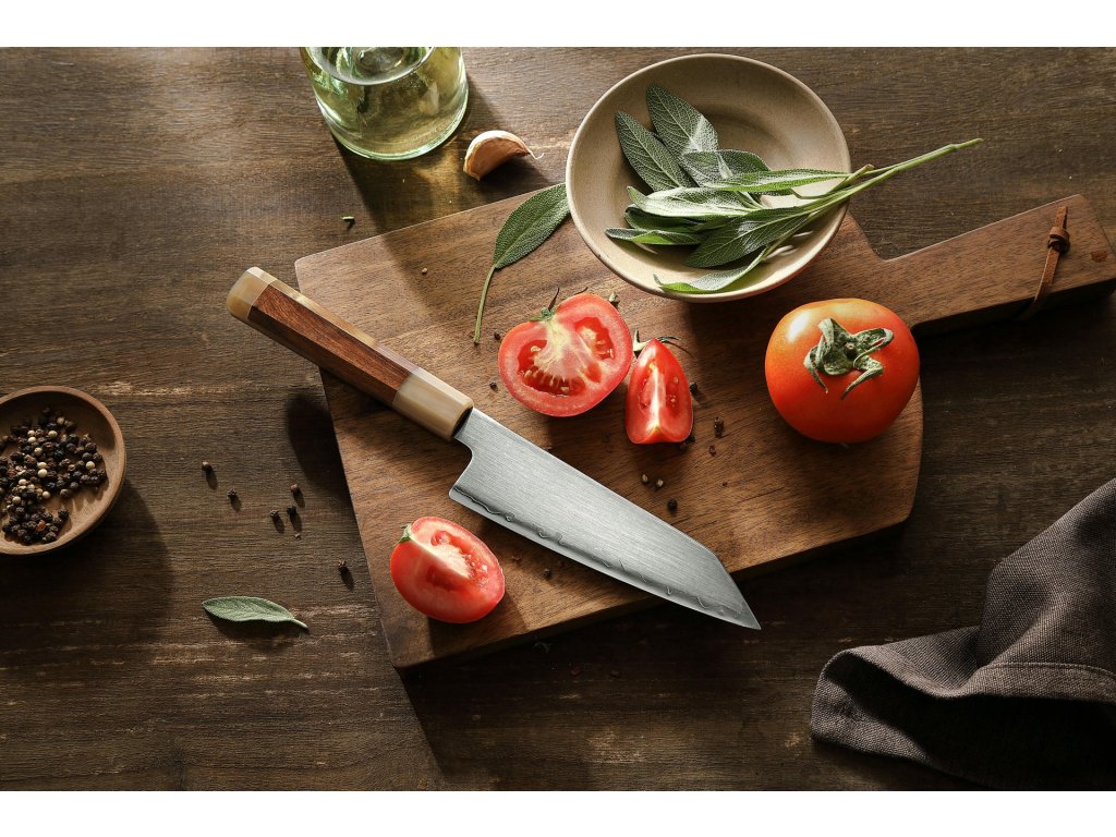 Rękojeść w tradycyjnym, japońskim ośmiokątnym kształcie została zaprojektowana z myślą o ergonomii i wygodnym trzymaniu nawet podczas długotrwałego użytkowania. Doskonałe wyważenie i wyprofilowane krawędzie zapobiegają wyślizgiwaniu się noża, nawet podczas pracy mokrymi rękami. Dzięki tej konstrukcji nóż jest odpowiedni zarówno dla osób prawo-, jak i leworęcznych.