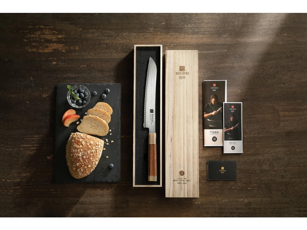 Luksusowy nóż do chleba XinZuo Zhen X05Z, 8,5", z ostrzem wykonanym ręcznie z japońskiej stali, z tradycyjną ośmiokątną rękojeścią, sprzedawany w eleganckim drewnianym pudełku.
