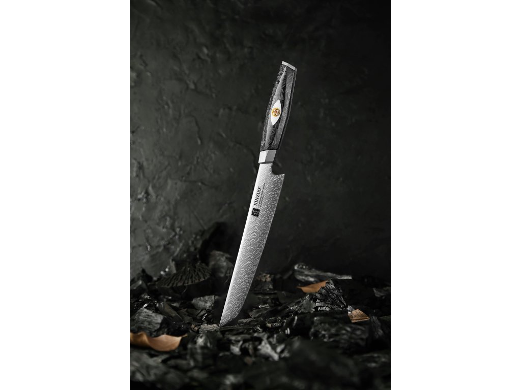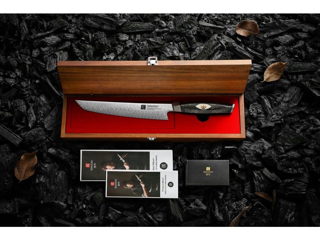 Nóż do mięsa klasy premium XinZuo Li X04 8,5" z ostrzem wykonanym z misternie skuwanych 145 warstw stali, tworzących unikalny wzór damasceński. Nowoczesna rękojeść z włókna węglowego w eleganckim drewnianym pudełku.