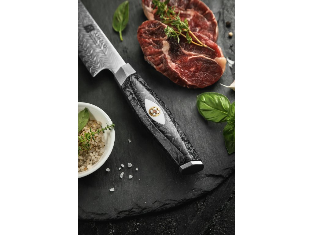 Zachwyca także nowoczesną rękojeścią z włókna węglowego i żywicy, która nadaje nożowi nie tylko wyjątkowy wygląd, ale także niezwykłe właściwości użytkowe. Każdy nóż z tej serii jest dodatkowo pakowany w luksusowe drewniane pudełko.