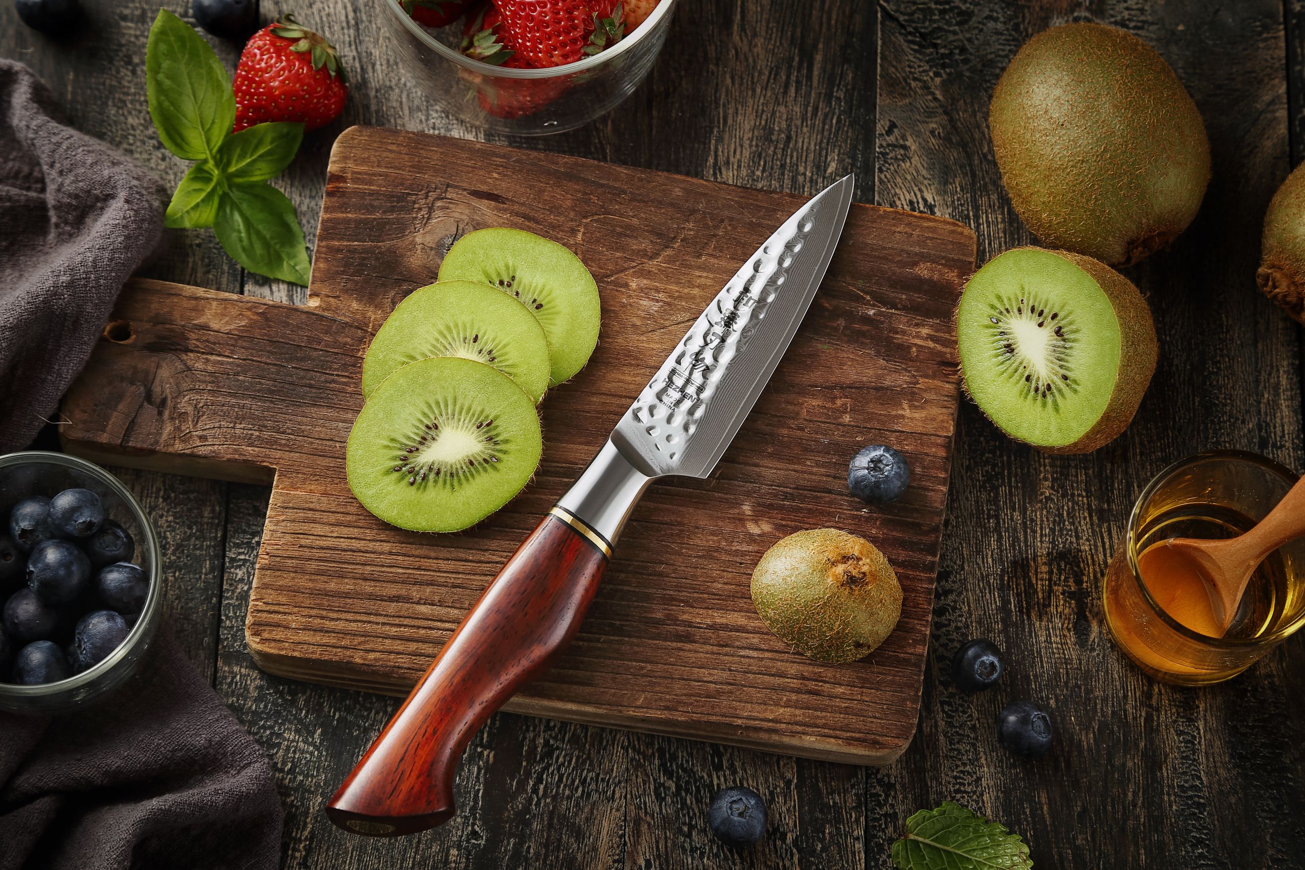 Nóż do obierania HEZHEN Master B30R 3,5" z ostrzem ze stali damasceńskiej klasy premium i stylową, ergonomiczną rękojeścią z palisandru - do łatwego obierania owoców i warzyw.