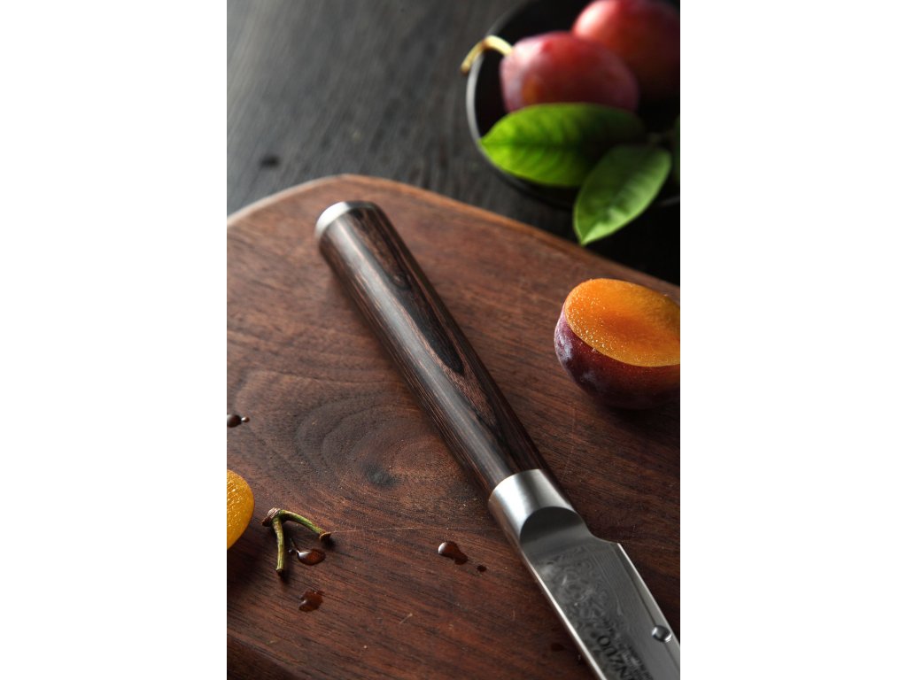 Prezentowany nóż do obierania produkowany jest z najwyższej jakości stali damasceńskiej (damascus steel), z której powstają noże klasy premium. Ostrze noża o twardości 60±2 w skali Rockwella składa się z 67 warstw stali. Jej wysoka jakość oraz tradycyjne metody produkcji zapewniają nożowi długą żywotność. Odcień wzoru na ostrzu może się nieco różnić od tego na zdjęciu, ponieważ stapianie warstw stali sprawia, że każdy nóż wygląda niepowtarzalnie. Rękojeść noża powstała z niewymagającego konserwacji materiału, który z upływem czasu nie mięknie ani nie chłonie zapachów. Jej doskonały kształt i długość umożliwiają łatwe, a także efektowne krojenie bez wyślizgiwania się noża z dłoni. Kolor i faktura materiału, z którego wykonano rękojeść noża mogą w rzeczywistości wyglądać nieco inaczej niż na zdjęciach ze względu na fakt, że produkowane są one z różnych kawałków drewna, w różnym wieku.