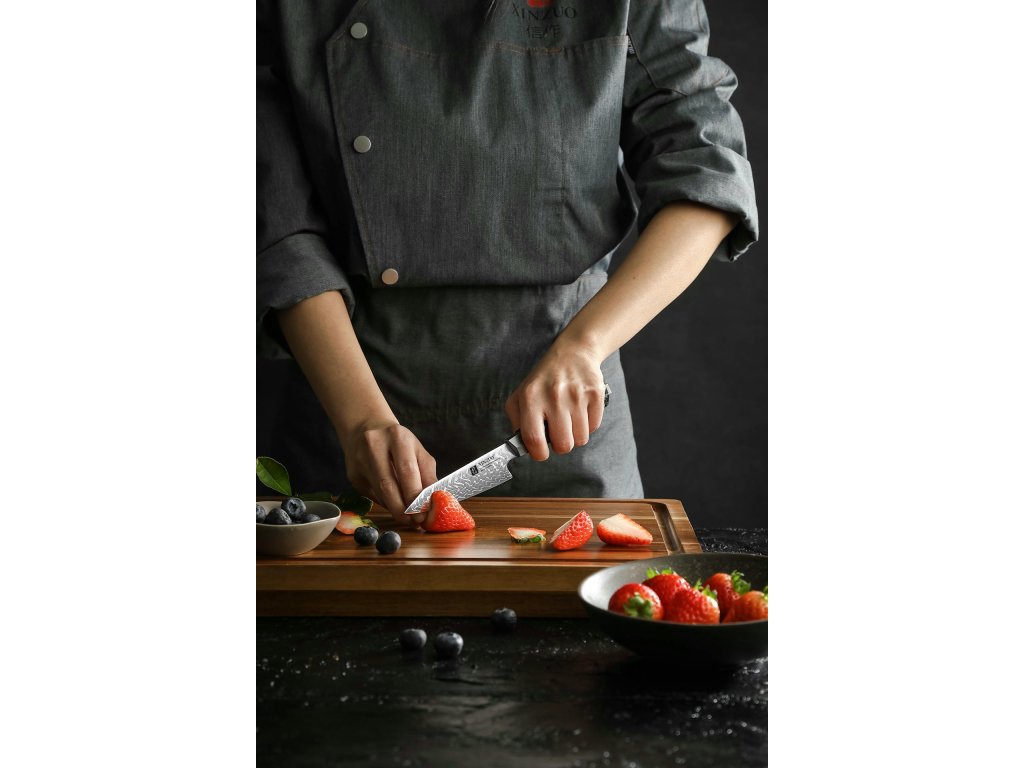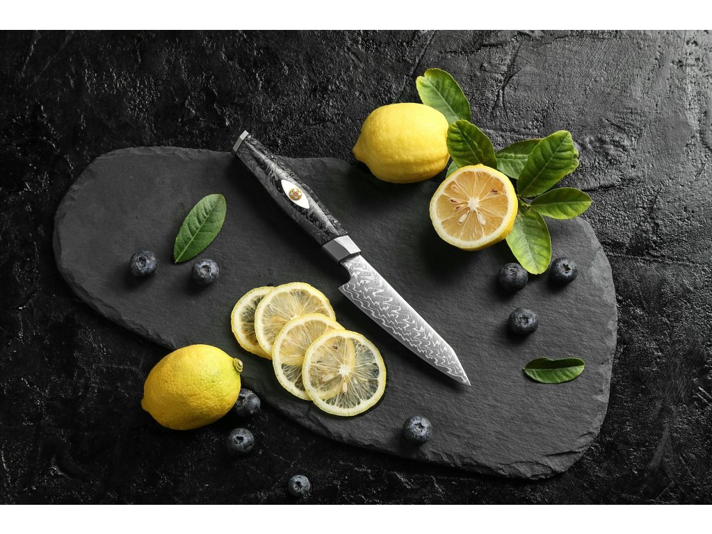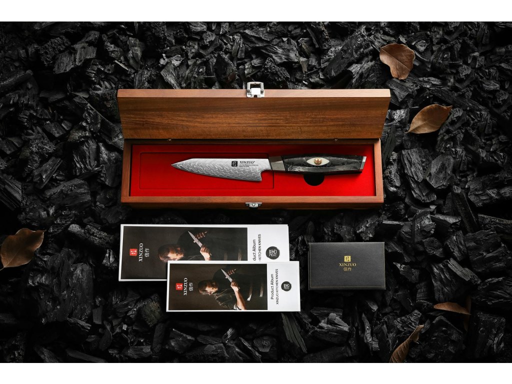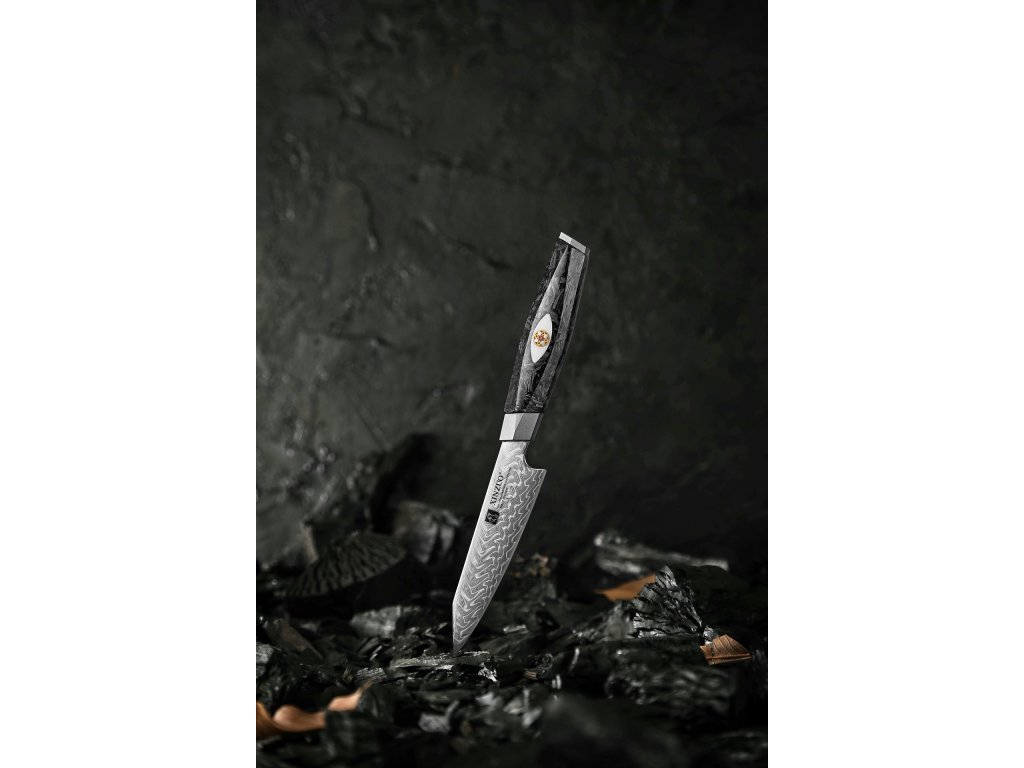 Nóż do obierania klasy premium XinZuo Li X04 4,5" z ostrzem wykonanym z misternie skuwanych 145 warstw stali, tworzących unikalny wzór damasceński. Nowoczesna rękojeść z włókna węglowego w eleganckim drewnianym pudełku.
