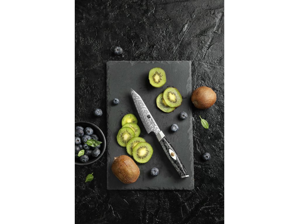 Ostrze tego noża do obierania wykonane jest ze 145 warstw stali. Jego rdzeń powstał z najwyższej jakości austriackiej stali proszkowej M390 (Powder Steel) marki BÖHLER, produkowanej z wykorzystaniem najnowocześniejszej technologii metalurgii proszków trzeciej generacji. Proces ten zapewnia rewolucyjną poprawę odporności na zużycie, a jednocześnie zwiększa wytrzymałość i twardość stali. Twardość ostrza osiąga 60–62 HRC.