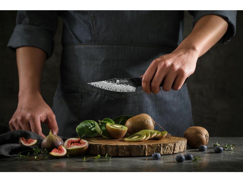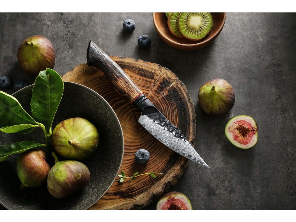 Prezentowany nóż do obierania produkowany jest z najwyższej jakości stali damasceńskiej (damascus steel), z której powstają noże klasy premium. Ostrze noża o twardości 60±2 w skali Rockwella składa się z 67 warstw stali. Jej wysoka jakość oraz tradycyjne metody produkcji zapewniają nożowi długą żywotność. Odcień wzoru na ostrzu może się nieco różnić od tego na zdjęciu, ponieważ stapianie warstw stali sprawia, że każdy nóż wygląda niepowtarzalnie. Noże ostrzone są ręcznie przez mistrzów nożownictwa pod kątem 15 ± 1° z obu stron.