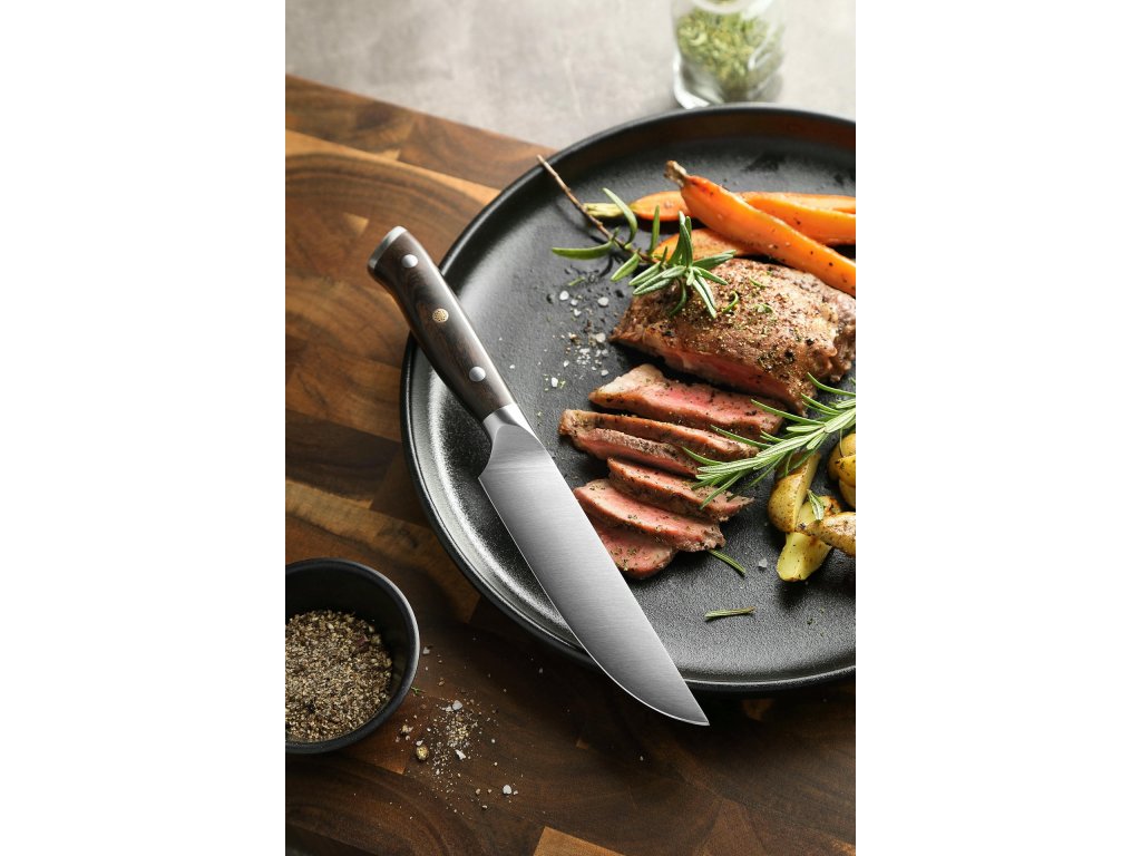 Prezentowany nóż do steków powstał z najlepszej stali nierdzewnej, z której produkuje się wysokiej jakości noże. Ostrze noża wyprodukowano z niemieckiej stali nierdzewnej o twardości 56-58 w skali Rockwella. Porządna stal w połączeniu z tradycyjnymi metodami produkcji gwarantują długą żywotność noża. Powierzchnia noża pozwala na idealne cięcia, zapobiegające zbędnym tarciom i przyklejaniu się produktów. Rękojeść powstała z najwyższej jakości hebanu, który z czasem nie mięknie ani nie chłonie zapachów. Jej doskonały kształt oraz długość umożliwiają łatwe, a także efektowne krojenie bez wyślizgiwania się noża z dłoni. Kolor i faktura materiału, z którego wykonano rękojeści noża mogą w rzeczywistości wyglądać nieco inaczej niż na zdjęciach ze względu na fakt, że produkowane są one z różnych kawałków drewna, w różnym wieku.