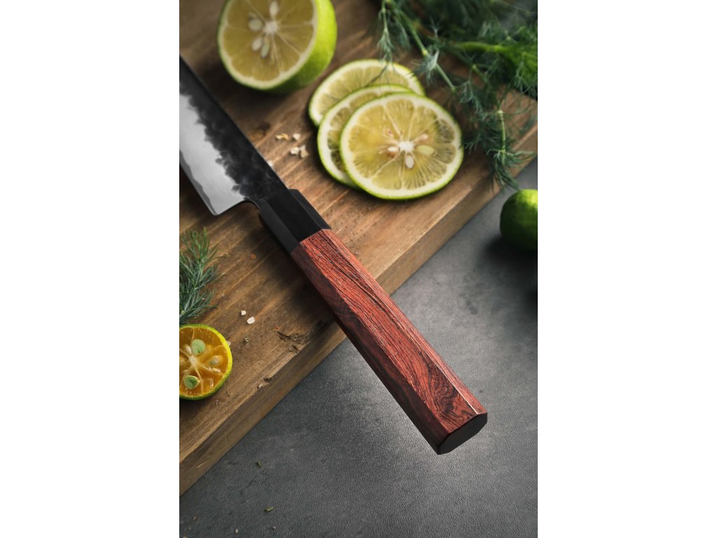Wzornictwo rękojeści noża HEZHEN z serii PM8S zachowuje ten sam styl retro, który prezentuje ostrze. Rękojeść o tradycyjnym kształcie inspirowanym japońskim stylem retro zaprojektowano z myślą o ergonomii i wygodnym chwycie, nawet podczas długotrwałego użytkowania, na co pozwala idealne wyważenie. Dzięki sprawdzonemu przez czas oktagonalnemu kształtowi rękojeści, nóż odpowiedni będzie do wygodnego krojenia zarówno prawą, jak i lewą ręką. Rękojeść powstała z wysokiej jakości drewna Rosewood, słynącego ze swej twardości. Nie mięknie ono z upływem czasu, nie pęka ani nie blednie. Nóż zaprojektowano do codziennego użytkowania; zarówno jego ostrze, jak i rękojeść mają długą żywotność. Kolor i faktura materiału, z którego wykonano rękojeść noża mogą w rzeczywistości wyglądać nieco inaczej niż na zdjęciach ze względu na fakt, że produkowane są one z różnych kawałków drewna, w różnym wieku.