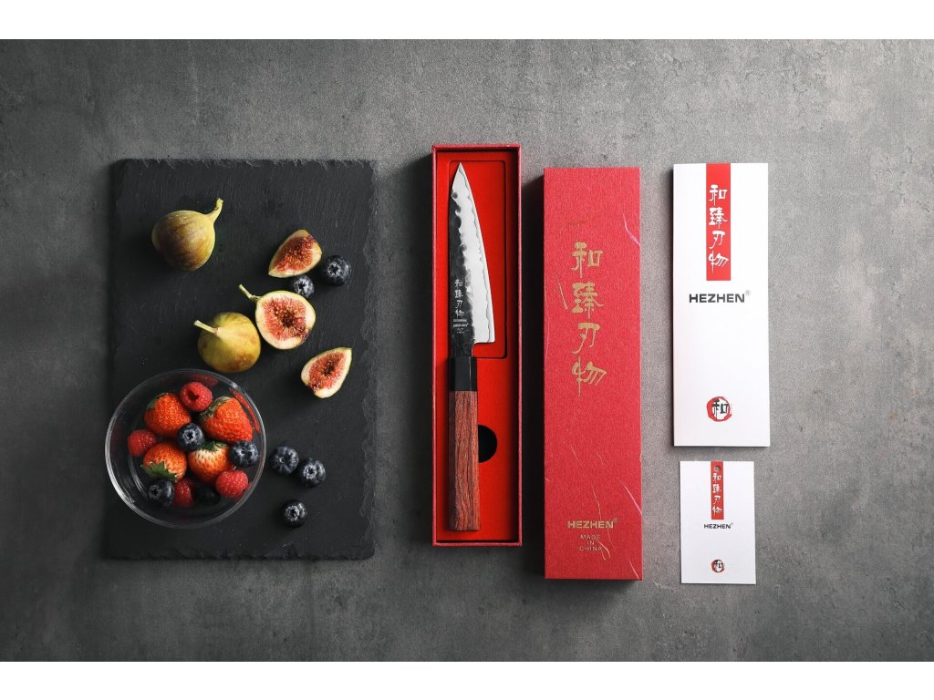 Nóż do warzyw i owoców HEZHEN PM8S 5,5" zapakowany jest w eleganckie, czerwone pudełko prezentowe, dzięki któremu stanowi idealny praktyczny prezent dla domu. Sprawdzi się jako prezent ślubny, z okazji przeprowadzki do nowego mieszkania, urodzin, każdej uroczystości czy zwykłych odwiedzin. Luksusowy wygląd pudełka oraz znajdującego się w nim stylowego noża HEZHEN z tradycyjną rękojeścią marki XinZuo ucieszą każdego obdarowanego.