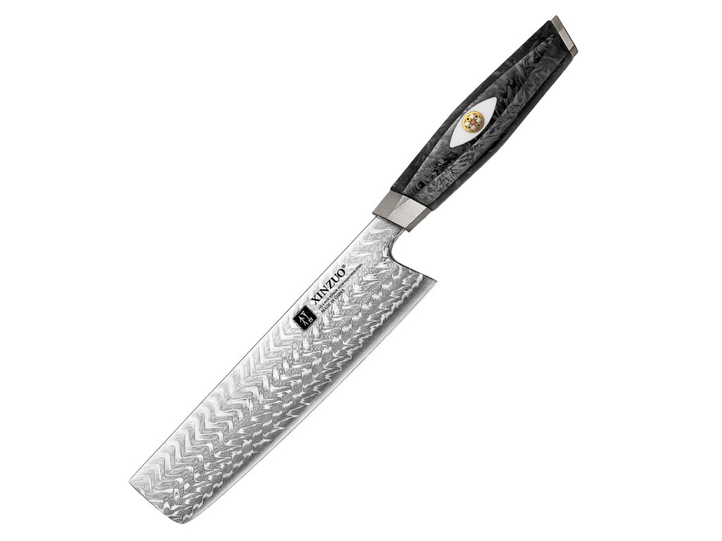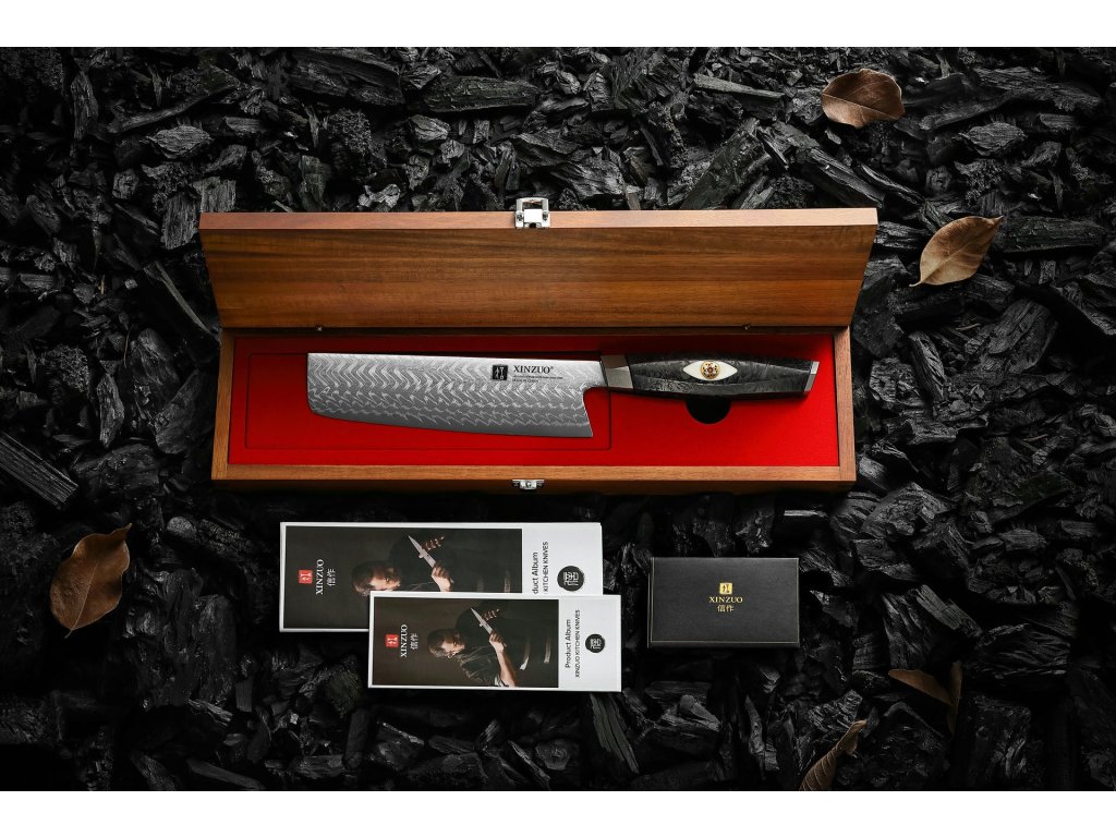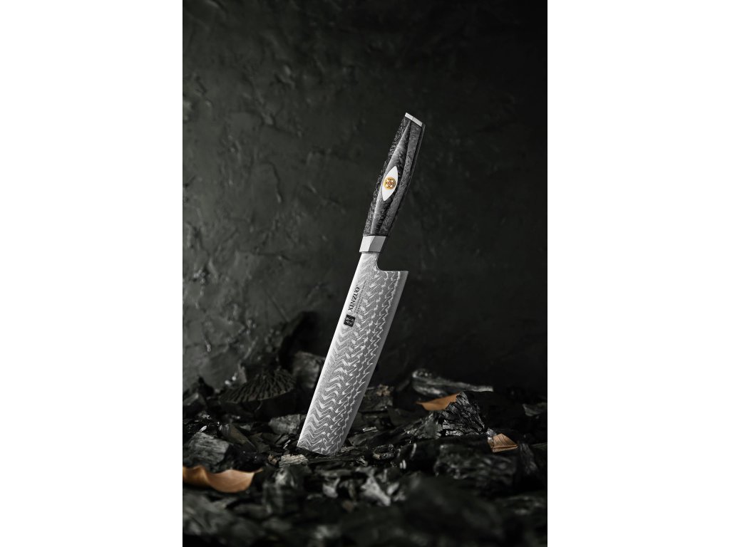 Nóż Nakiri klasy premium XinZuo Li X04 7" z ostrzem wykonanym z misternie skuwanych 145 warstw stali, tworzących unikalny wzór damasceński. Nowoczesna rękojeść z włókna węglowego w eleganckim drewnianym pudełku.