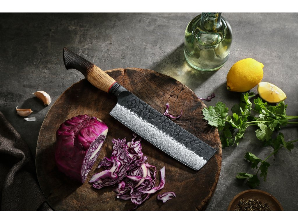 Nóż Nakiri XinZuo Mo X06 z wyjątkowym ostrzem ze stali damasceńskiej i ręcznie wykonaną rękojeścią z białego dębu, którego kolor przechodzi od jasnych, ciepłych tonów do ciemnego, przydymionego zakończenia.