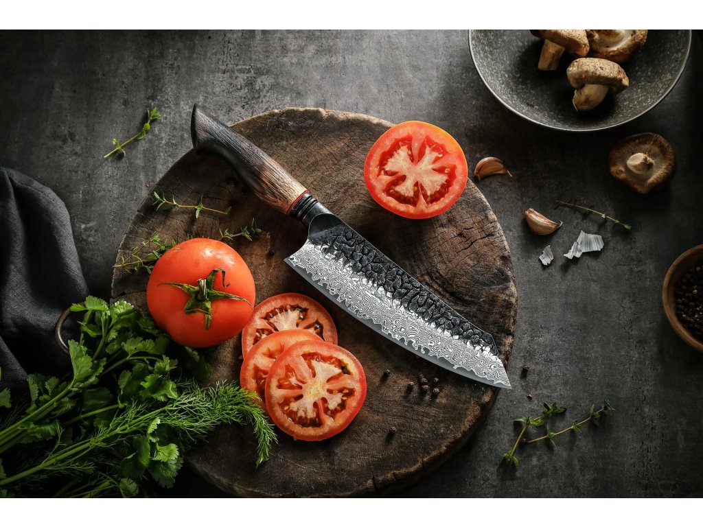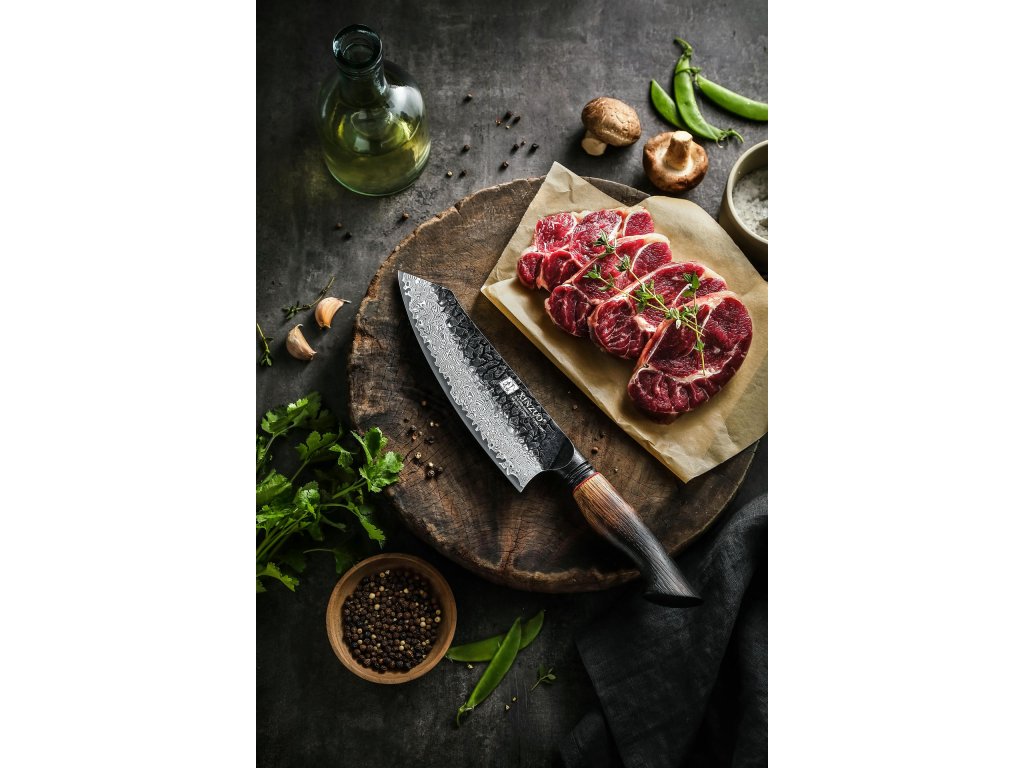 Prezentowany nóż Santoku produkowany jest z najwyższej jakości stali damasceńskiej (damascus steel), z której powstają noże klasy premium. Ostrze noża o twardości 60±2 w skali Rockwella składa się z 67 warstw stali. Jej wysoka jakość oraz tradycyjne metody produkcji zapewniają nożowi długą żywotność. Odcień wzoru na ostrzu może się nieco różnić od tego na zdjęciu, ponieważ stapianie warstw stali sprawia, że każdy nóż wygląda niepowtarzalnie. Noże ostrzone są ręcznie przez mistrzów nożownictwa pod kątem 15 ± 1° z obu stron.