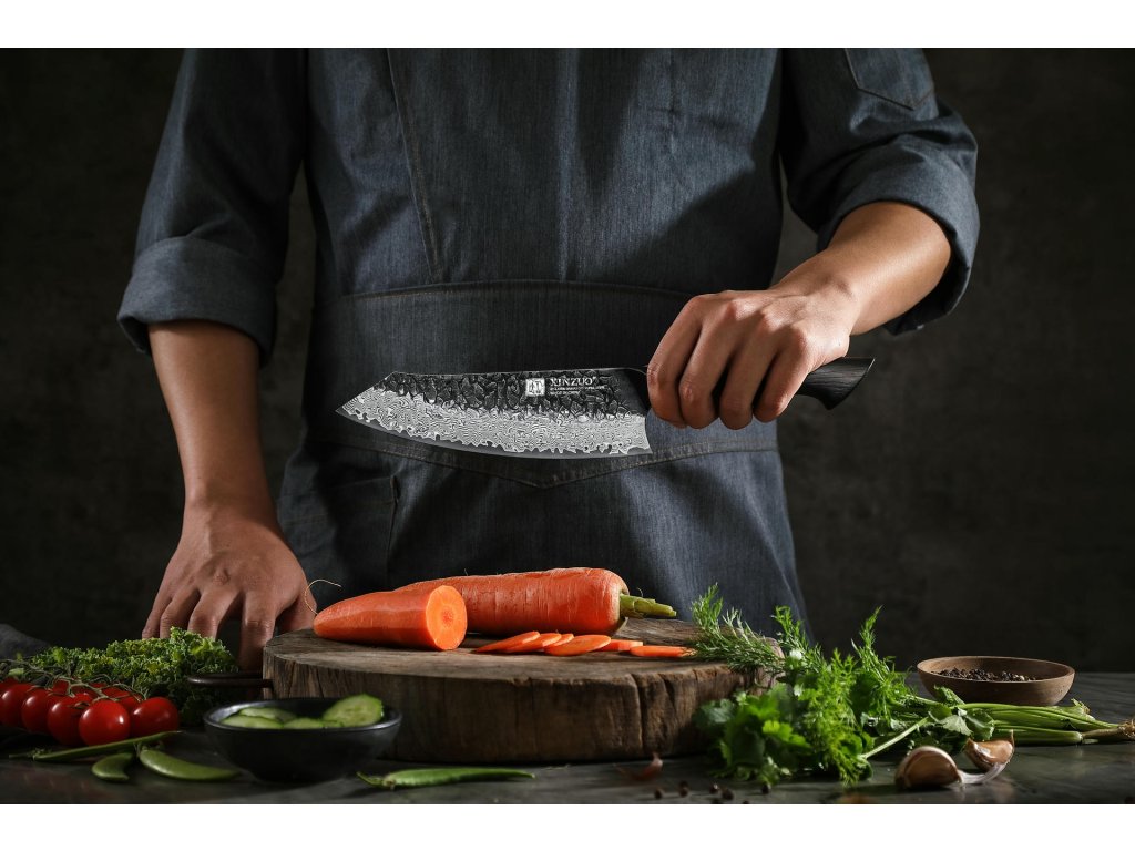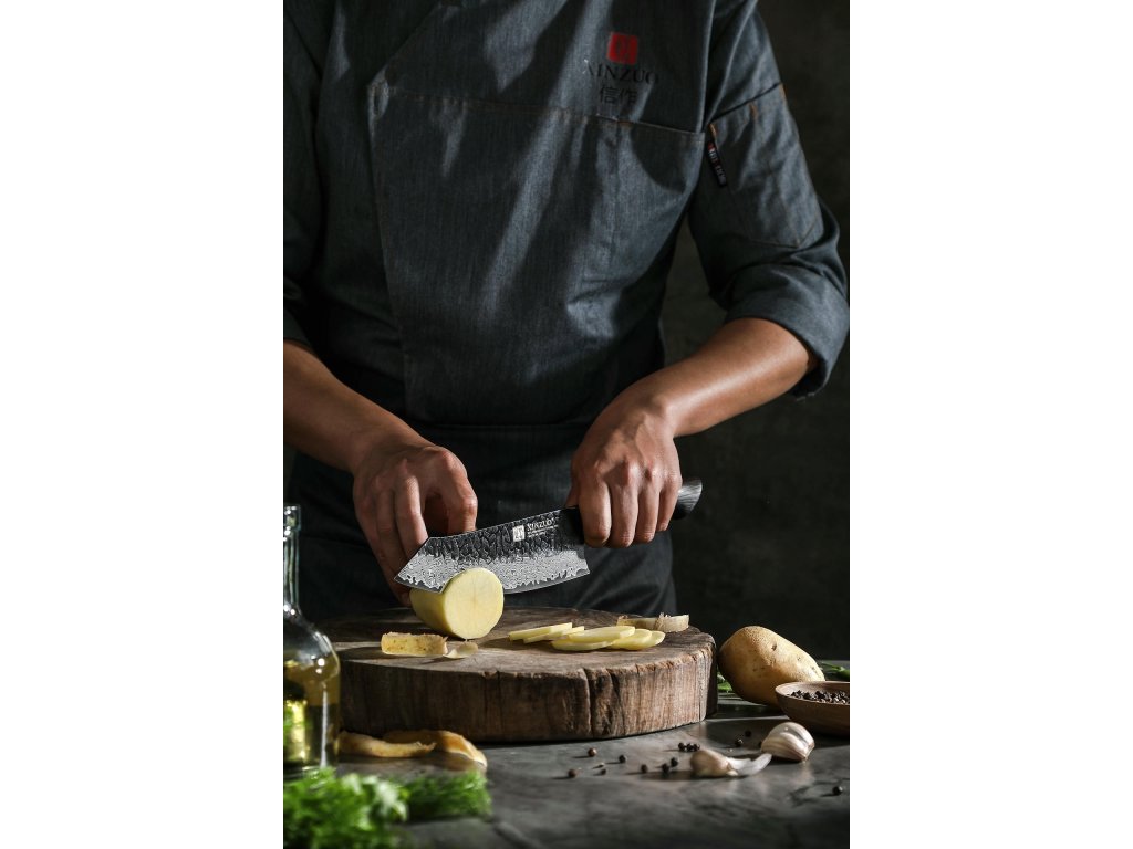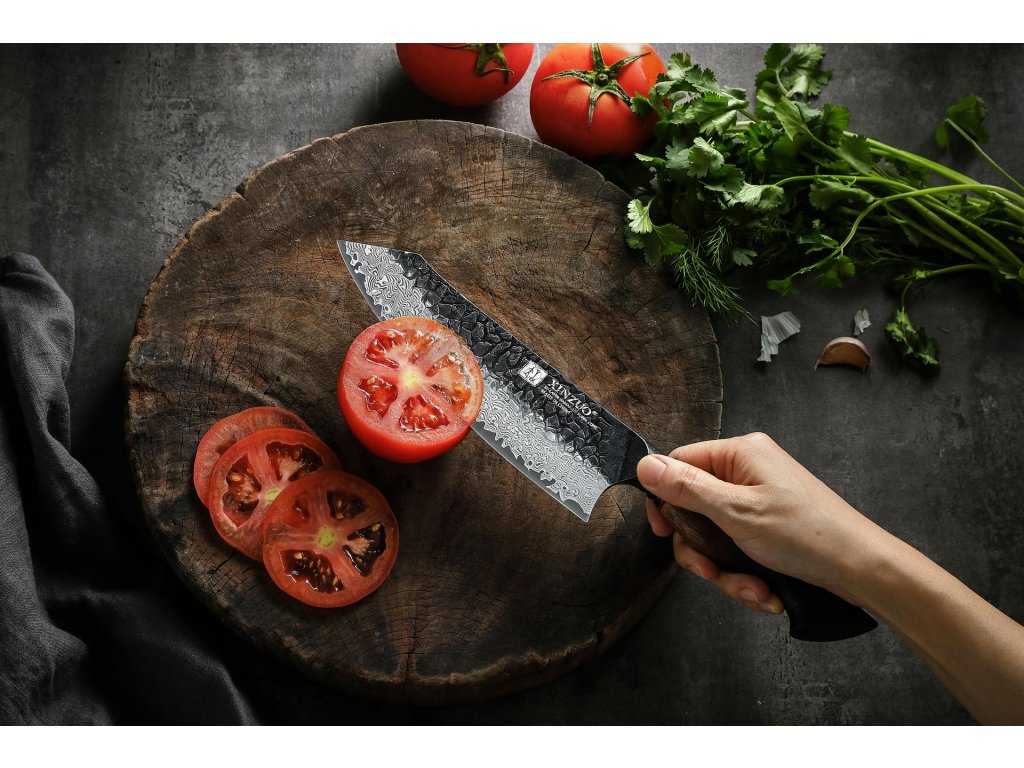 Ciekawostka: jako wiodący innowator w dziedzinie produkcji noży kuchennych XinZuo łączy ze sobą tradycyjne i najnowocześniejsze technologie. Dzięki zastosowanej nowatorskiej metodzie próżniowej obróbki cieplnej noże kuchenne XinZuo charakteryzują się - w porównaniu z nożami powstałymi przy wykorzystaniu standardowej obróbki cieplnej - większą twardością i ostrością, a ponadto dłuższą żywotnością. W połączeniu z tradycyjnym, wieńczącym proces produkcji ręcznym ostrzeniem noży przez mistrzów tego rzemiosła, których przekazywanemu z pokolenia na pokolenie kunsztowi nie może się równać żadna maszyna, skutkuje to tym, że noże kuchenne XinZuo są także wyjątkowo ostre. Noże ostrzone maszynowo nie mają szans na osiągnięcie tego poziomu ostrości.