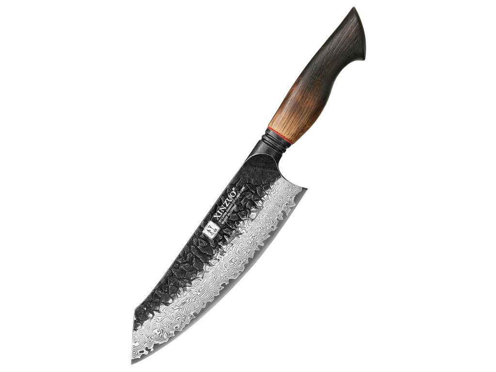Nóż Santoku XinZuo Mo X06 7,5" z wyjątkowym ostrzem ze stali damasceńskiej i ręcznie wykonaną rękojeścią z białego dębu, którego kolor przechodzi od jasnych, ciepłych tonów do ciemnego, przydymionego zakończenia.
