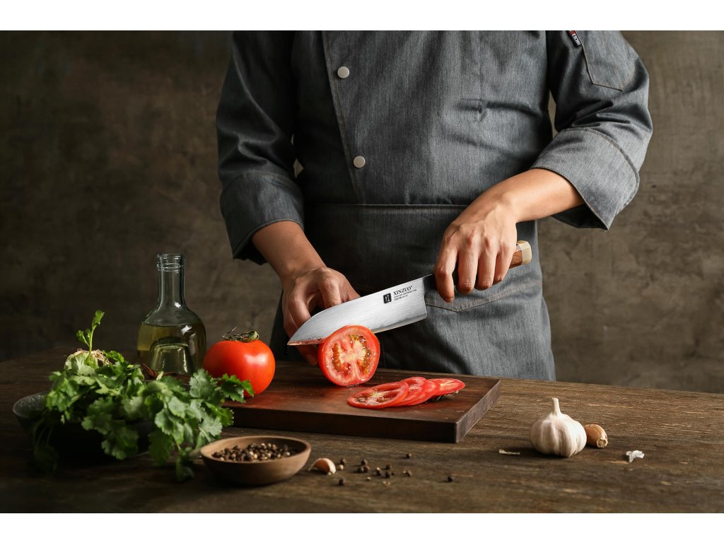 Ciekawostka: jako wiodący innowator w dziedzinie produkcji noży kuchennych XinZuo łączy ze sobą tradycyjne i najnowocześniejsze technologie. Dzięki zastosowanej nowatorskiej metodzie próżniowej obróbki cieplnej noże kuchenne XinZuo charakteryzują się - w porównaniu z nożami powstałymi przy wykorzystaniu standardowej obróbki cieplnej - większą twardością i ostrością, a ponadto dłuższą żywotnością. W połączeniu z tradycyjnym, wieńczącym proces produkcji ręcznym ostrzeniem noży przez mistrzów tego rzemiosła, których przekazywanemu z pokolenia na pokolenie kunsztowi nie może się równać żadna maszyna, skutkuje to tym, że noże kuchenne XinZuo są także wyjątkowo ostre. Noże ostrzone maszynowo nie mają szans na osiągnięcie tego poziomu ostrości.