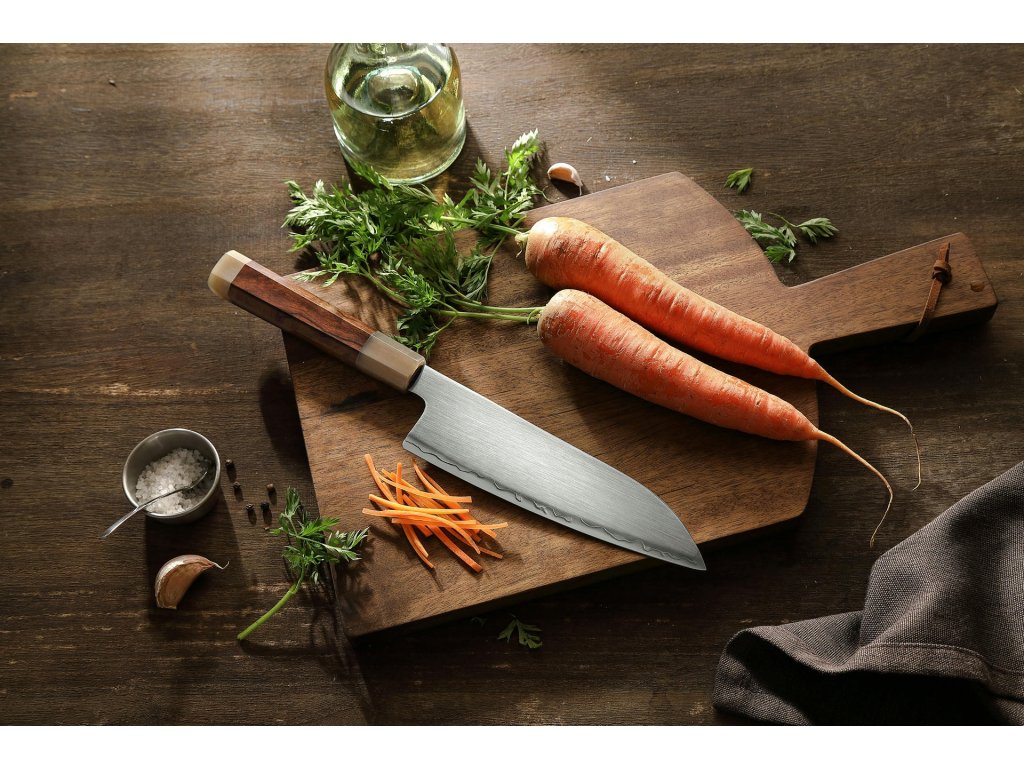 Santoku to popularne na całym świecie noże typu japońskiego. Łatwo je rozpoznać już na pierwszy rzut oka po ikonicznym, bardzo szerokim ostrzu. Nóż Santoku poradzi sobie zarówno z owocami i warzywami, jak i mięsem. Rozmiary noża Santoku pozwalają na ułatwiające pracę przenoszenie pokrojonych produktów na jego ostrzu. Noża Santoku nie powinno zabraknąć w żadnym domu. Idealny do przygotowywania warzyw na japońskie i ogólnie azjatyckie zupy, sajgonki oraz dania główne.