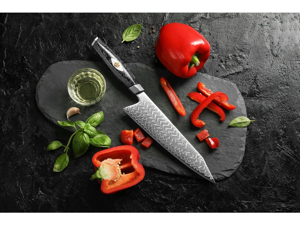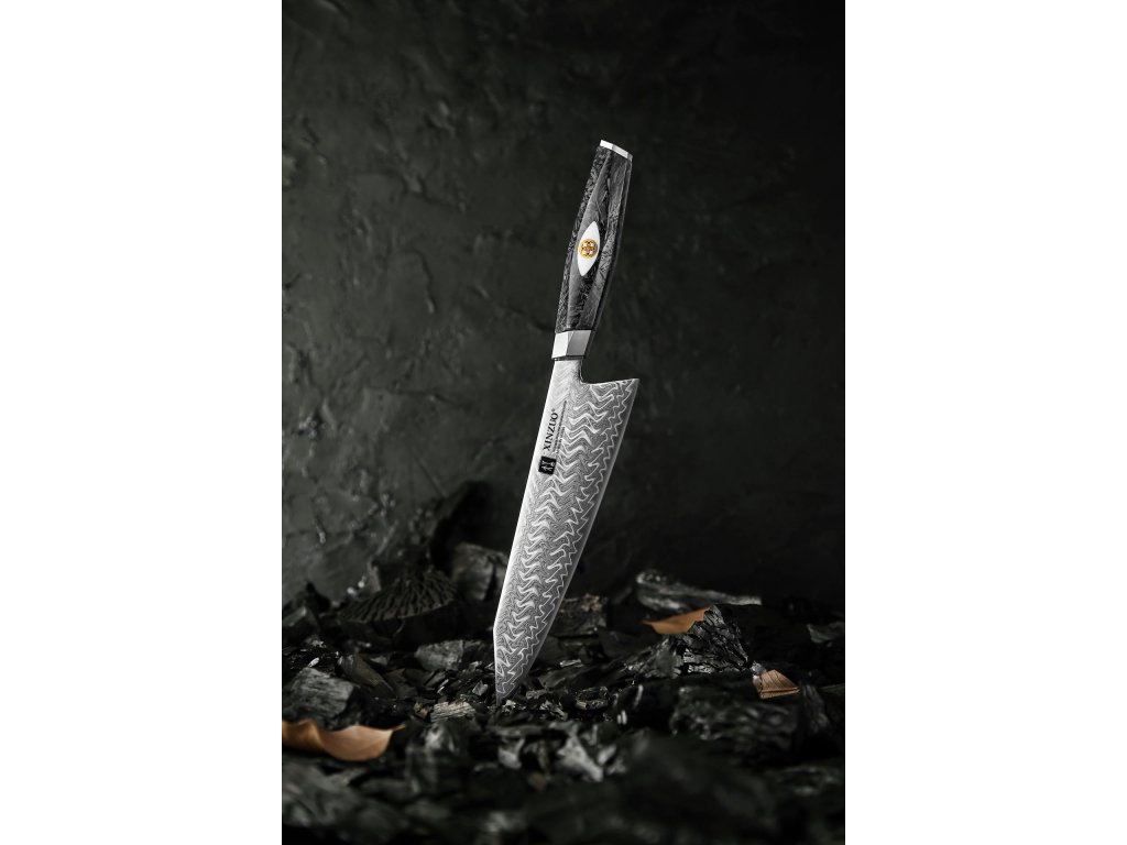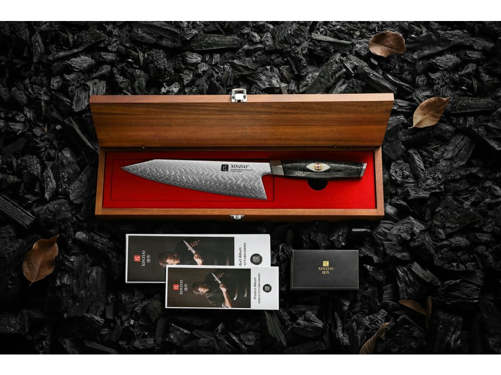 Nóż szefa kuchni klasy premium XinZuo Li X04 8,5" z ostrzem wykonanym z misternie skuwanych 145 warstw stali, tworzących unikalny wzór damasceński. Nowoczesna rękojeść z włókna węglowego w eleganckim drewnianym pudełku.