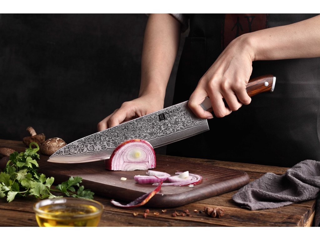 Prezentowany nóż szefa kuchni produkowany jest z najwyższej jakości stali damasceńskiej (damascus steel), z której powstają noże klasy premium. Ostrze noża o twardości 60±2 w skali Rockwella składa się z 67 warstw stali. Jej wysoka jakość oraz tradycyjne metody produkcji zapewniają nożowi długą żywotność. Odcień wzoru na ostrzu może się nieco różnić od tego na zdjęciu, ponieważ stapianie warstw stali sprawia, że każdy nóż wygląda niepowtarzalnie. Rękojeść noża powstała z niewymagającego konserwacji materiału, który z upływem czasu nie mięknie ani nie chłonie zapachów. Jej doskonały kształt i długość umożliwiają łatwe, a także efektowne krojenie bez wyślizgiwania się noża z dłoni. Kolor i faktura materiału, z którego wykonano rękojeść noża mogą w rzeczywistości wyglądać nieco inaczej niż na zdjęciach ze względu na fakt, że produkowane są one z różnych kawałków drewna, w różnym wieku.