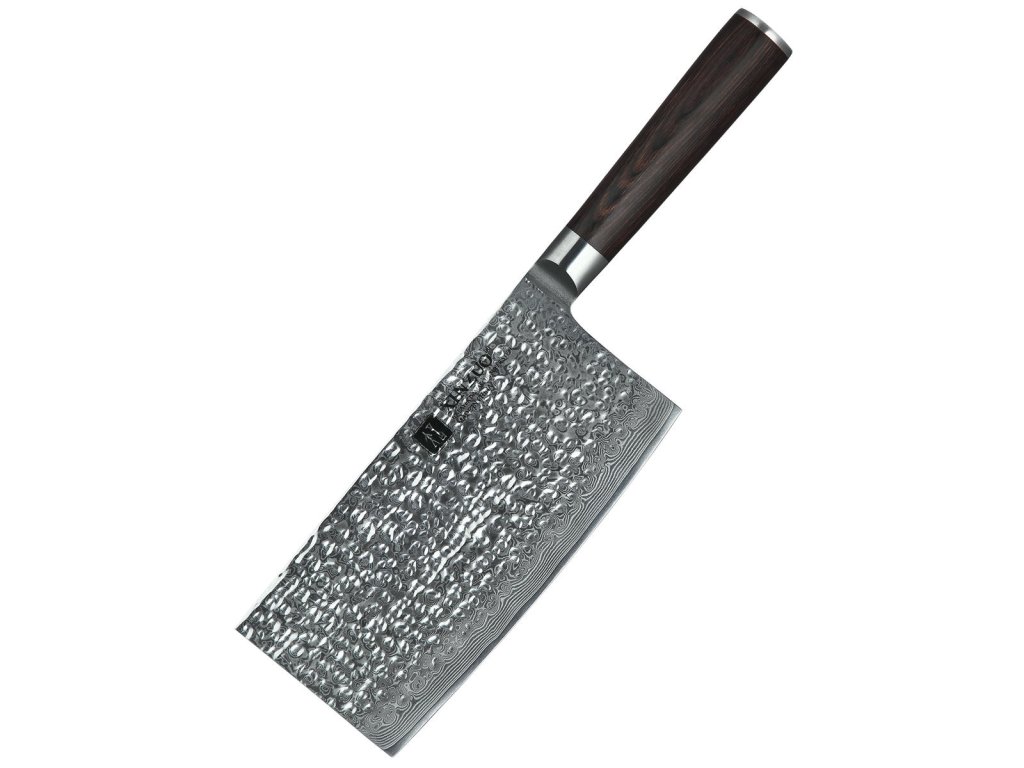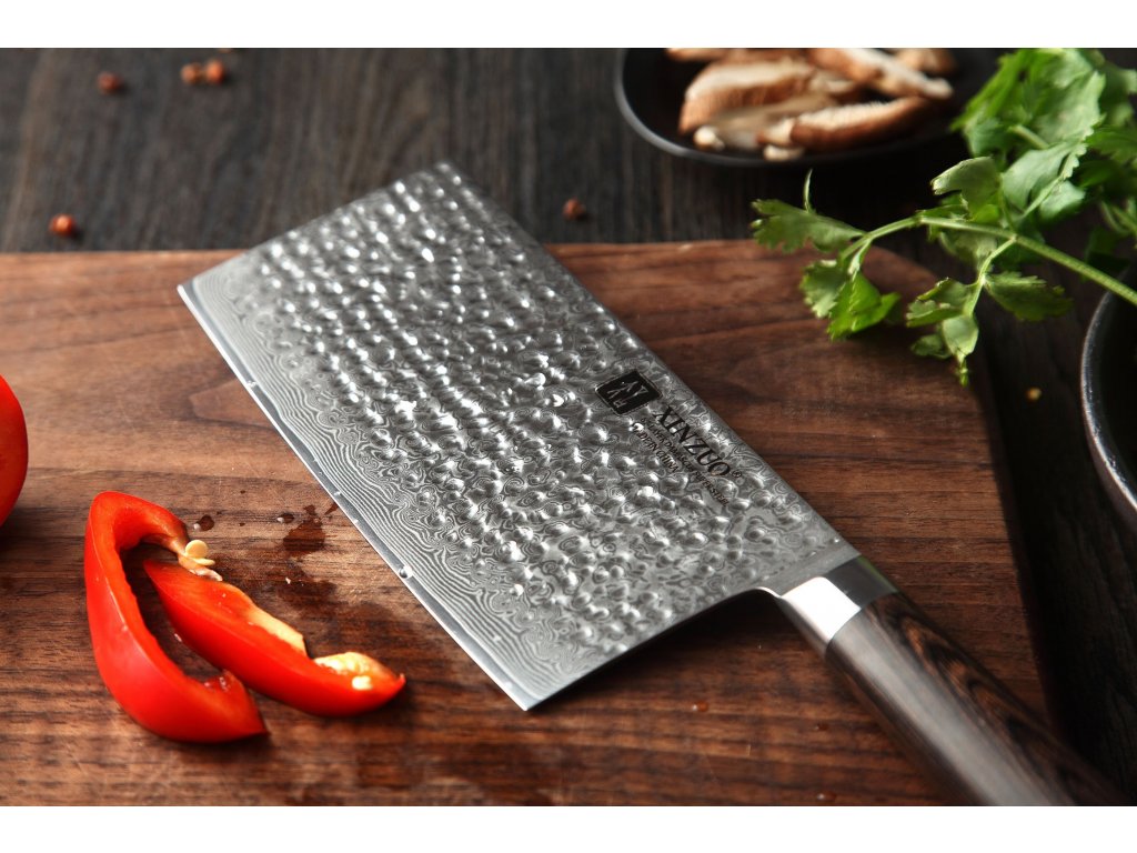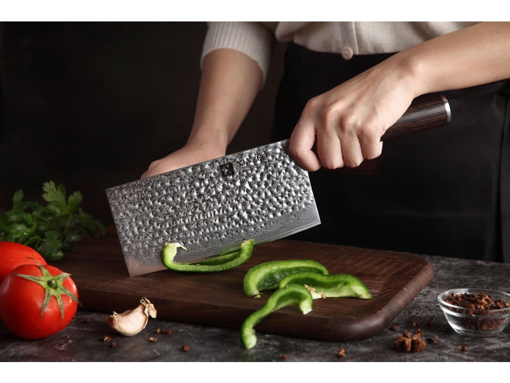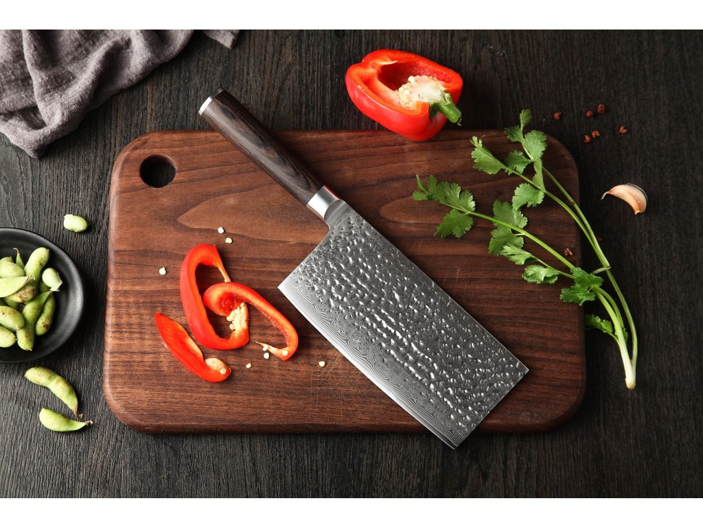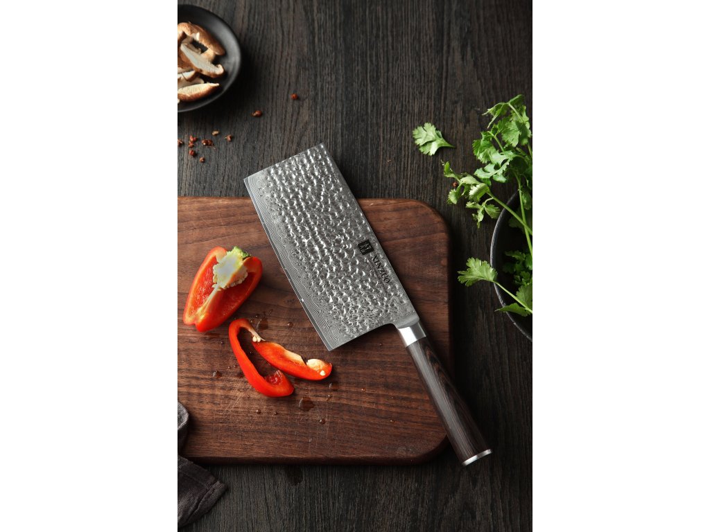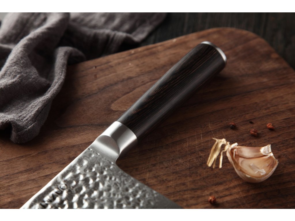 Uniwersalny chiński nóż TAO XinZuo He B1H 7" z poddanym ręcznej obróbce ostrzem z wysokiej jakości stali damasceńskiej.