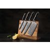 W zestawie tym znajdują się noże z najwyższej jakości stali damasceńskiej (damascus steel), z której produkuje się najlepsze noże. Ostrze noża o twardości 60±2 w skali Rockwella składa się z 67 warstw stali. Jej wysoka jakość oraz tradycyjne metody produkcji zapewniają nożowi długą żywotność. Odcień wzoru na ostrzu może się nieco różnić od tego na zdjęciu, ponieważ stapianie warstw stali sprawia, że każdy nóż wygląda niepowtarzalnie. Rękojeść noża powstała z niewymagającego konserwacji materiału, który z upływem czasu nie mięknie i nie chłonie zapachów. Jej doskonały kształt oraz długość umożliwiają łatwe i efektowne krojenie bez wyślizgiwania się noża z dłoni. Kolor i faktura materiału, z którego wykonano rękojeść noża mogą w rzeczywistości wyglądać nieco inaczej niż na zdjęciach ze względu na fakt, że produkowane są one z różnych kawałków drewna, w różnym wieku. Zestaw zawiera także drewniany stojak magnetyczny z drewna akacjowego z gumowymi nóżkami, zapobiegającymi jego ślizganiu się.