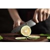 - Nóż Santoku: Santoku to popularne na całym świecie noże typu japońskiego. Łatwo je rozpoznać już na pierwszy rzut oka po ikonicznym, bardzo szerokim ostrzu. Nóż Santoku poradzi sobie zarówno z owocami i warzywami, jak i mięsem. Rozmiary noża Santoku pozwalają na ułatwiające pracę przenoszenie pokrojonych produktów na jego ostrzu.