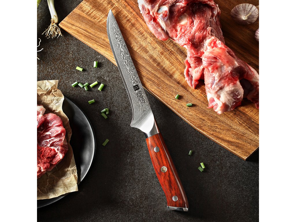 W zestawie tym znajdują się noże z najwyższej jakości stali damasceńskiej (damascus steel), z której produkuje się najlepsze noże. Ostrze noża o twardości 60±2 w skali Rockwella składa się z 67 warstw stali. Jej wysoka jakość oraz tradycyjne metody produkcji zapewniają nożowi długą żywotność. Odcień wzoru na ostrzu może się nieco różnić od tego na zdjęciu, ponieważ stapianie warstw stali sprawia, że każdy nóż wygląda niepowtarzalnie. Rękojeść noża powstała z niewymagającego konserwacji materiału, który z upływem czasu nie mięknie i nie chłonie zapachów. Jej doskonały kształt oraz długość umożliwiają łatwe i efektowne krojenie bez wyślizgiwania się noża z dłoni. Kolor i faktura materiału, z którego wykonano rękojeść noża mogą w rzeczywistości wyglądać nieco inaczej niż na zdjęciach ze względu na fakt, że produkowane są one z różnych kawałków drewna, w różnym wieku. W skład zestawu wchodzi także drewniany blok na noże i nożyce do drobiu ze stali nierdzewnej 3Cr14.