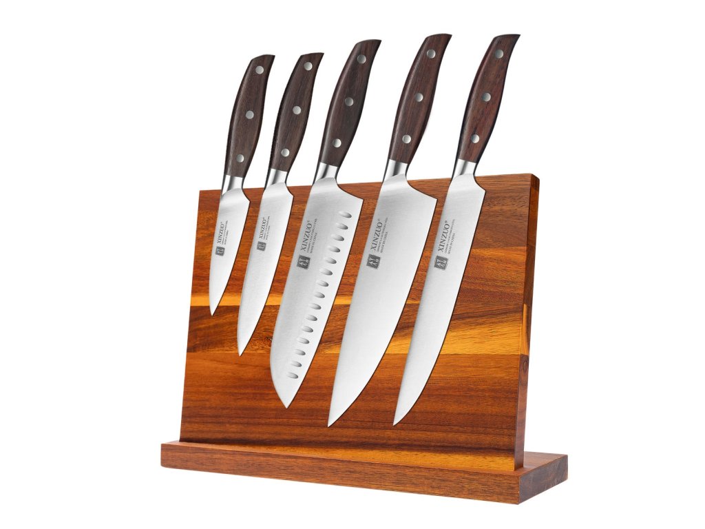 Zestaw pięciu noży XinZuo Zhi B35 z wysokiej jakości stali nierdzewnej, z rękojeścią z drewna sandałowego i idealnie ostrym, poddanym ręcznej obróbce ostrzem wraz z designerskim stojakiem magnetycznym na noże.